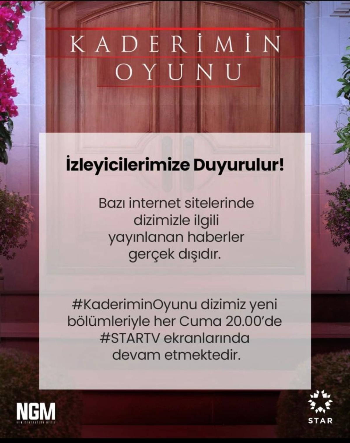 Yapım şirketinden yapılan açıklamada; "Bazı internet sitelerinde dizimizle ilgili yayınlanan haberler gerçek dışıdır. Kaderimin Oyunu dizimiz yeni bölümleriyle her Cuma 20.00'de Star Tv ekranlarında devam etmektedir" denildi.