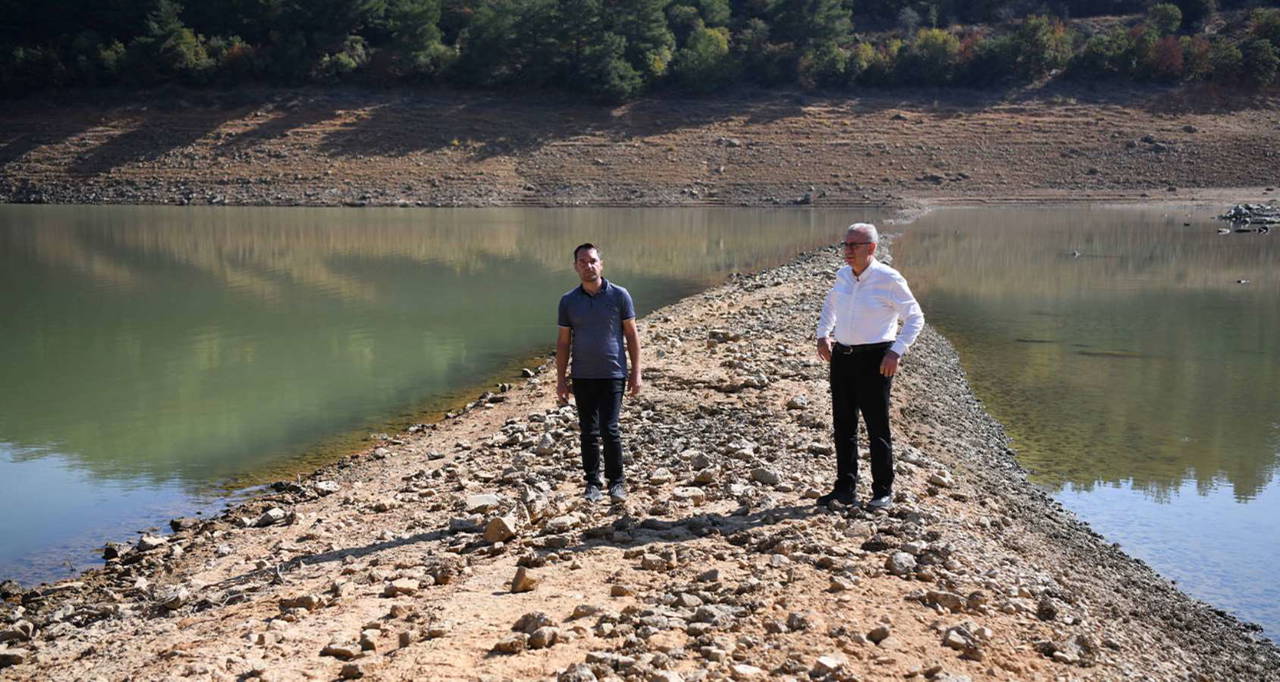 Keşan’a içme suyunun sağlandığı Kadıköy Barajı’nda incelemelerde bulunarak, su seviyesi ile ilgili Su ve Kanalizasyon İşleri Müdürü Erhan Başaran’dan bilgi alan Belediye Başkanı Helvacıoğlu, barajdaki su seviyesinin düşüklüğünü göstermek için barajın ortasına kadar yürüdü.