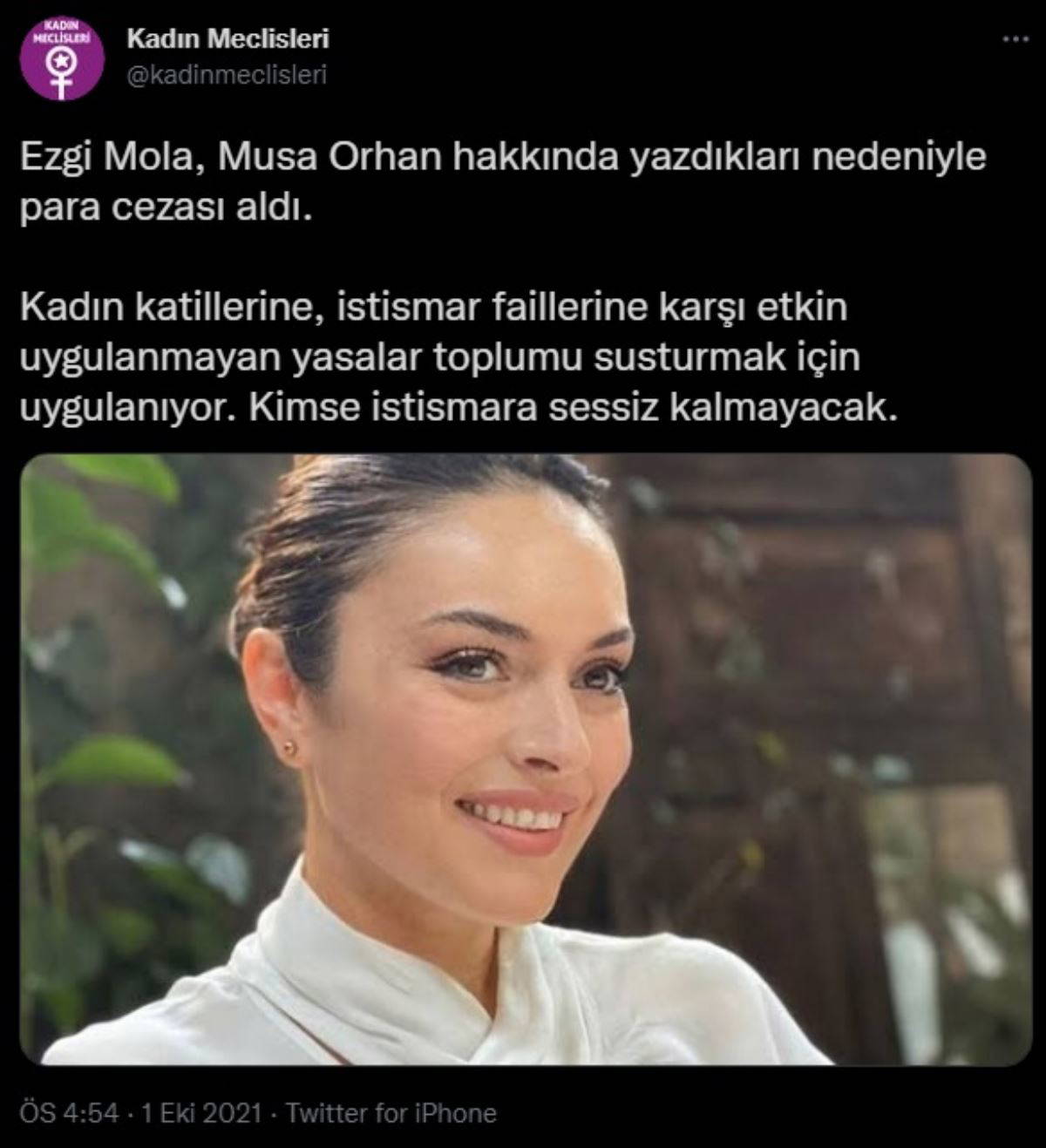 Kadın Meclisleri’nin Twitter hesabından yapılan paylaşımda, “Ezgi Mola, Musa Orhan hakkında yazdıkları nedeniyle para cezası aldı. Kadın katillerine, istismar faillerine karşı etkin uygulanmayan yasalar toplumu susturmak için uygulanıyor. Kimse istismara sessiz kalmayacak” ifadeleri kullanıldı.
