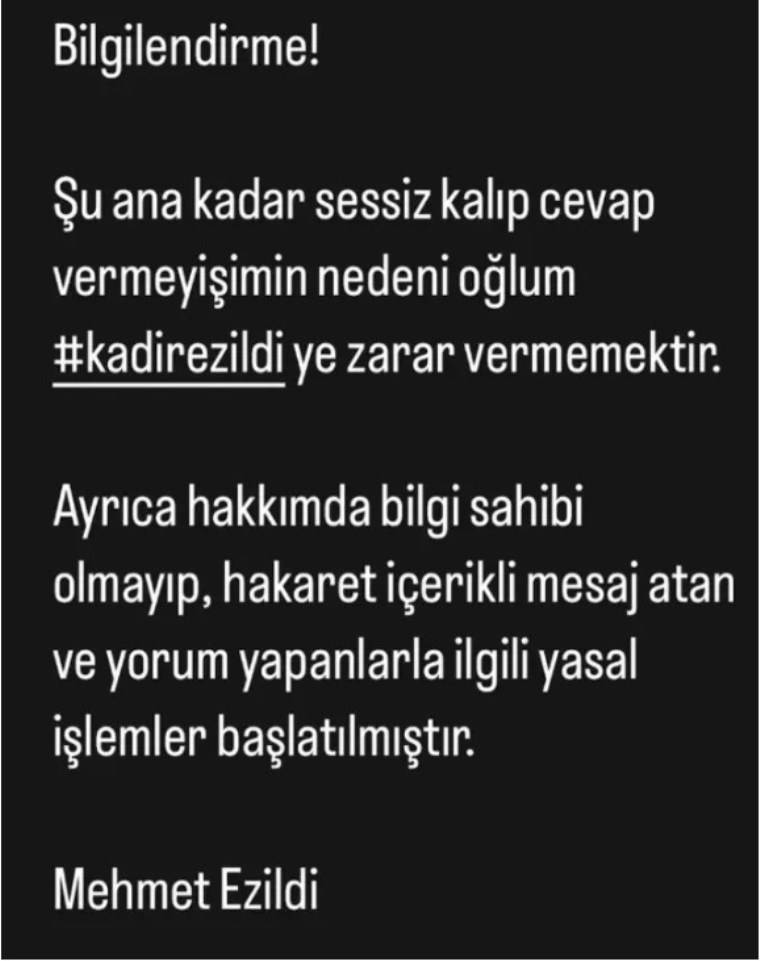 Hakkında yapılan yorumlara tepki gösteren Mehmet Ezildi, Instagram hesabından yaptığı paylaşımda "Şu ana kadar sessiz kalıp cevap vermeyişimin nedeni oğlum Kadir Ezildi'ye zarar vermemektir. Ayrıca hakkımda bilgi sahibi olmayıp, hakaret içerikli mesaj atan ve yorum yapanlarla ilgili yasal işlemler başlatılmıştır" dedi.