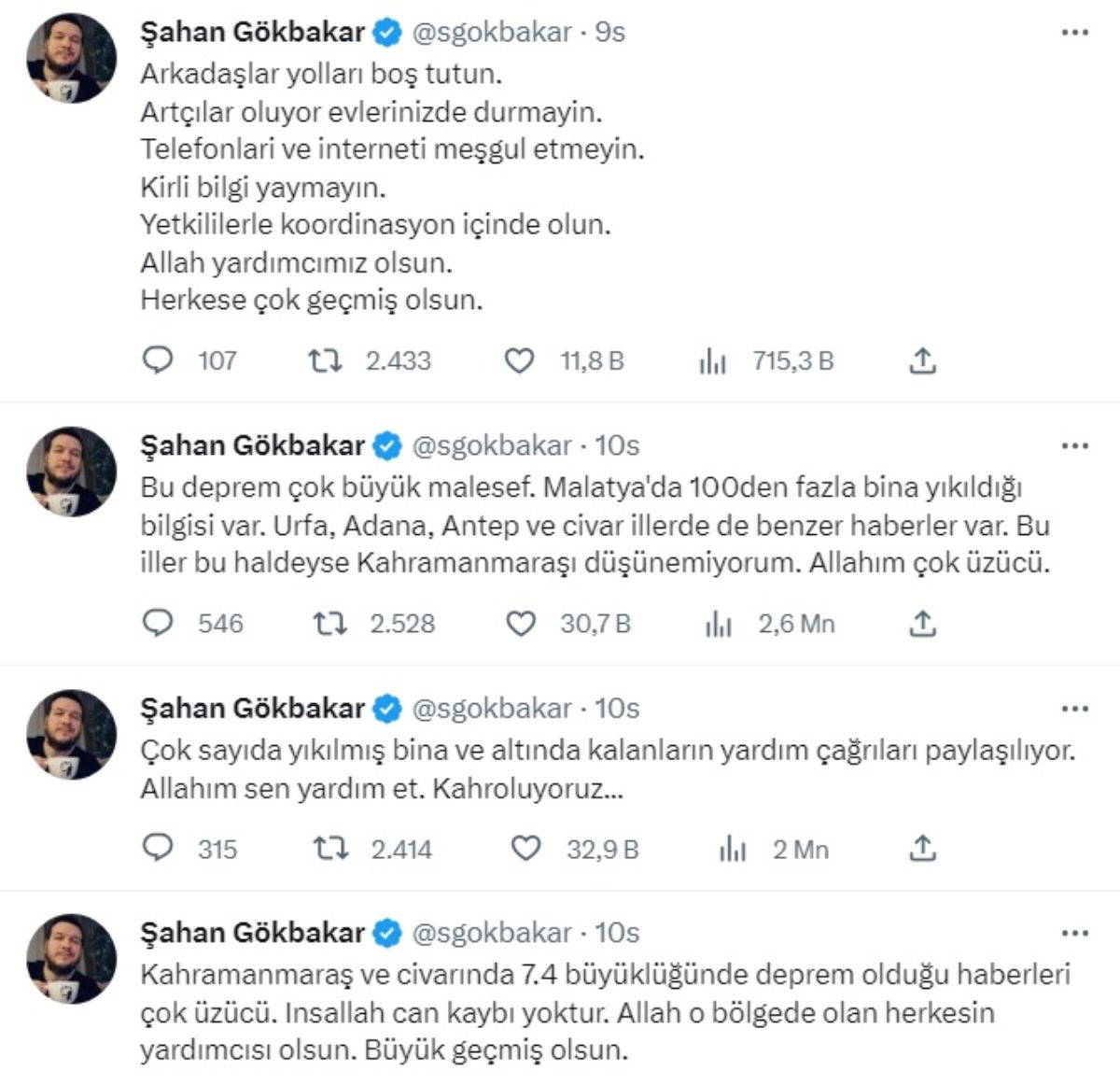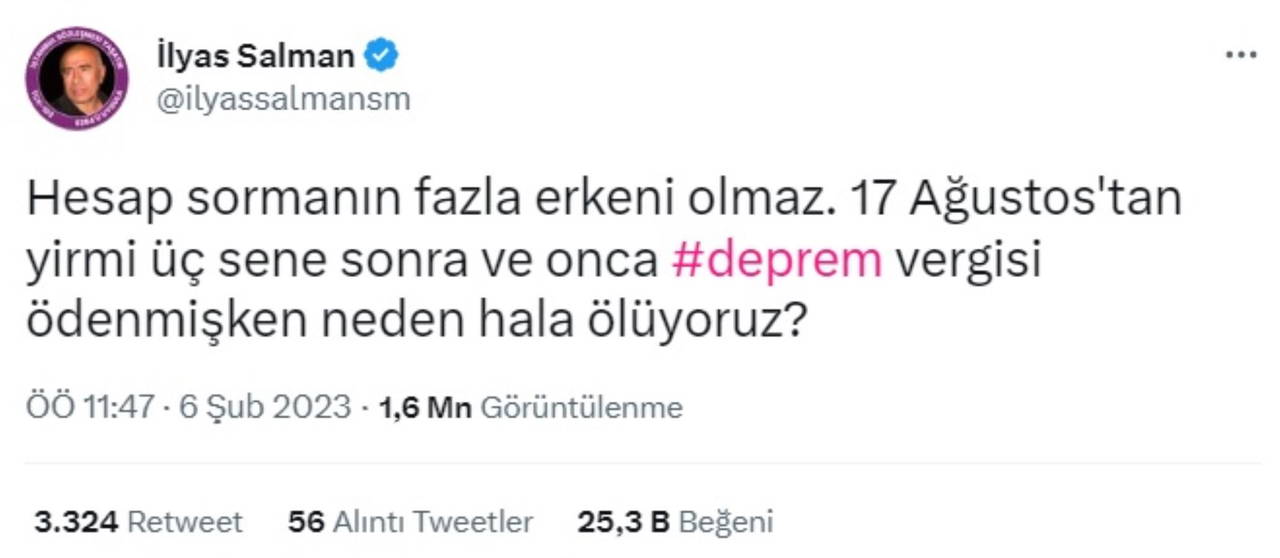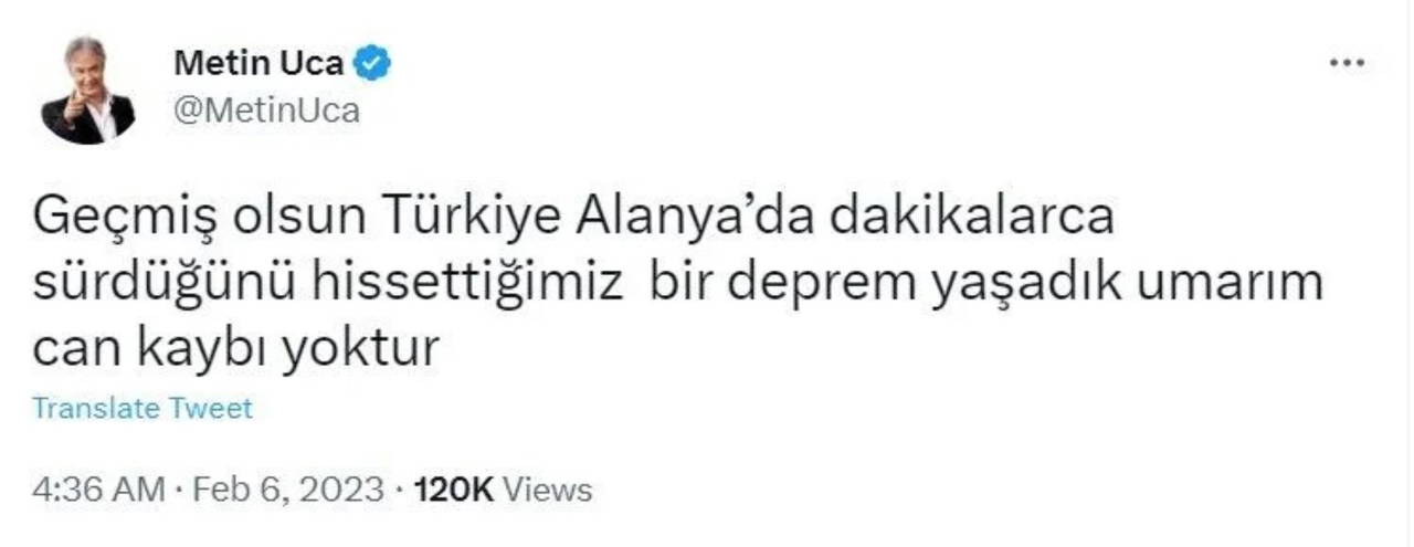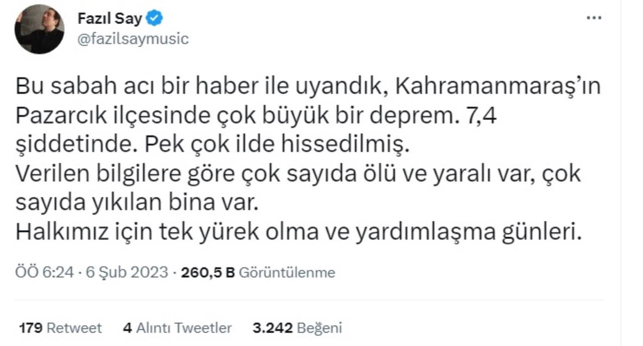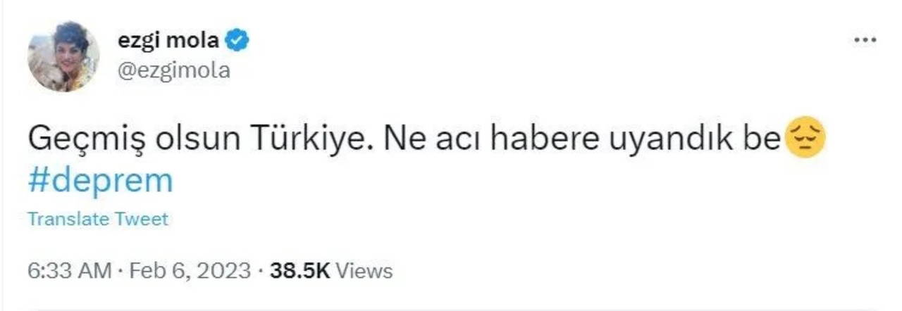 Selda Bağcan, Erol Evgin, Emel Sayın, oyuncu Tolga Sarıtaş gibi isimler de "Geçmiş olsun Türkiye" temennisini paylaşırken, şarkıcı Sibel Can, oyuncu ve şarkıcı Murat Boz ve oyuncu Cengiz Coşkun da yaşamını yitirenlere rahmet, kalanlara acil şifa dileğinde bulundu.