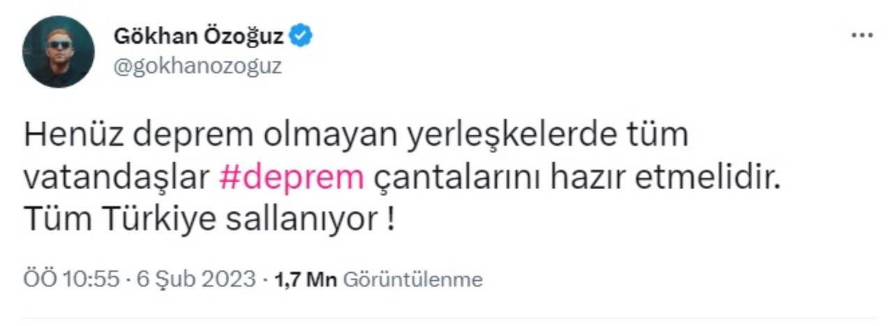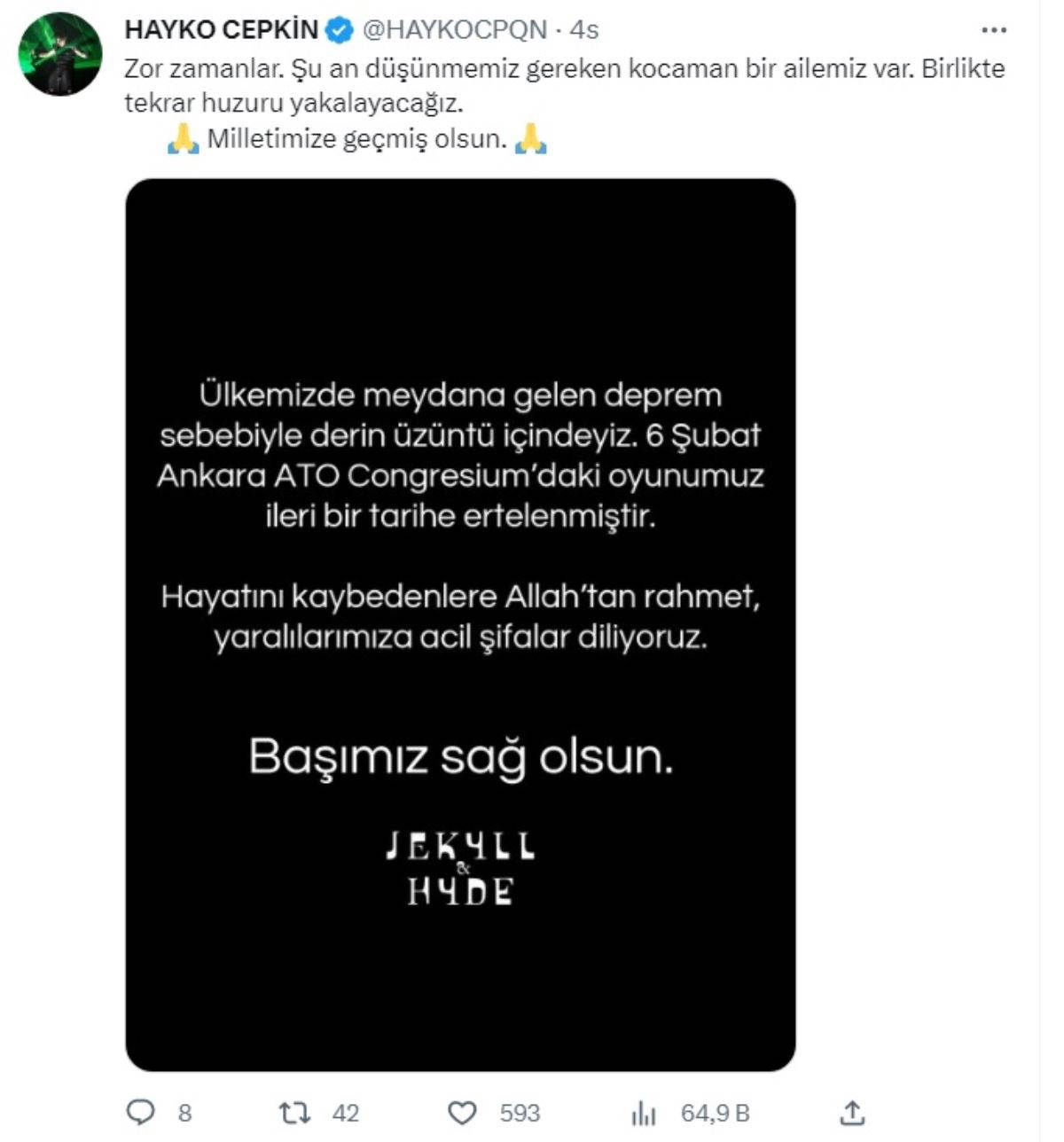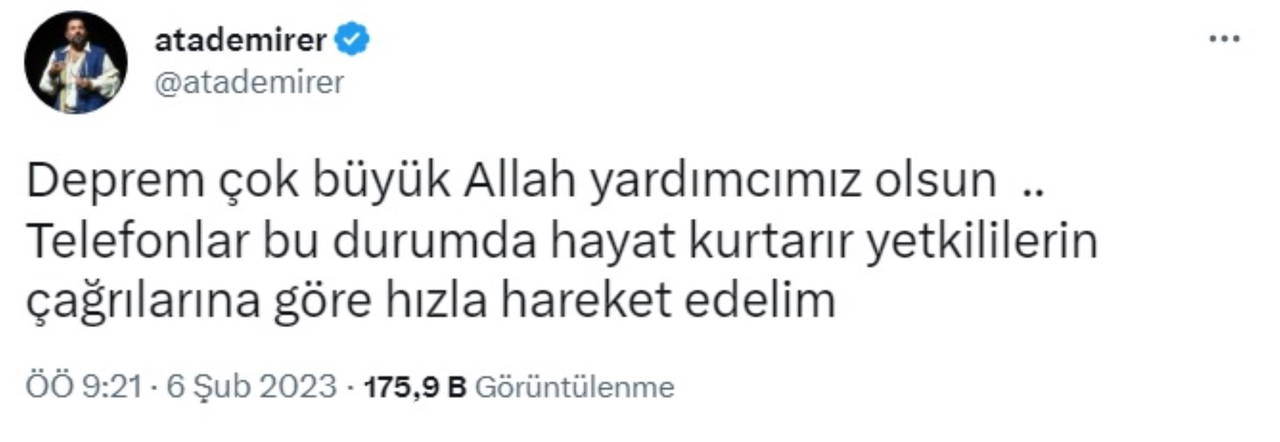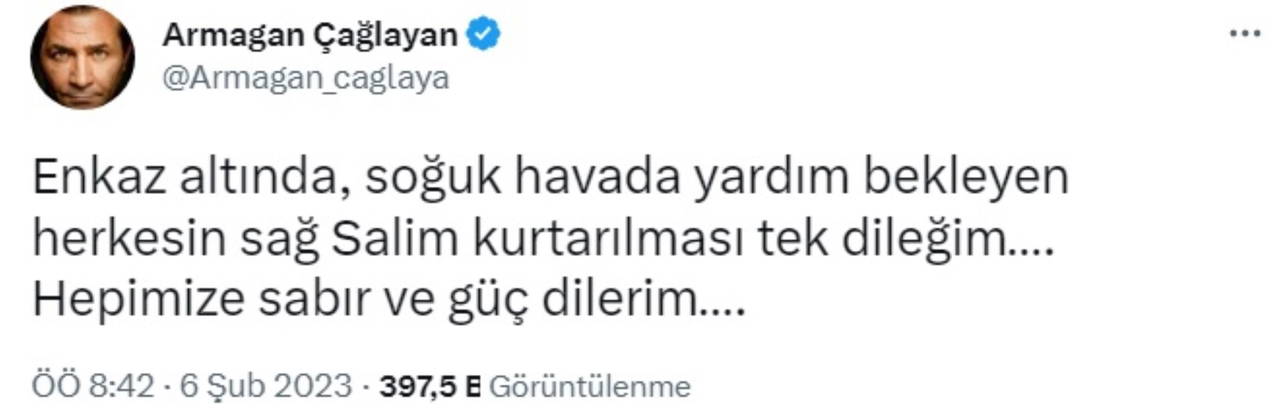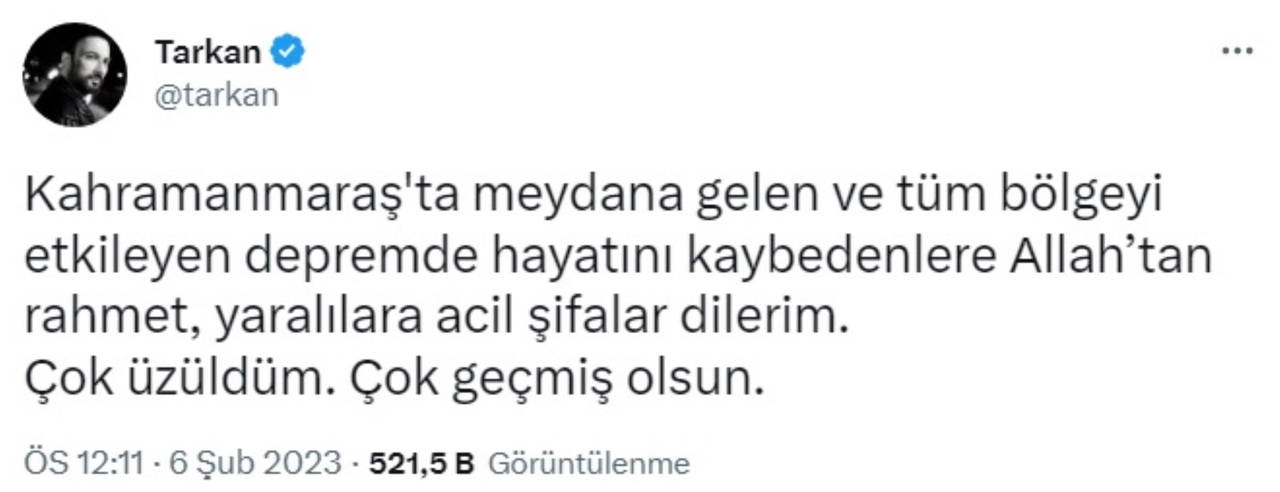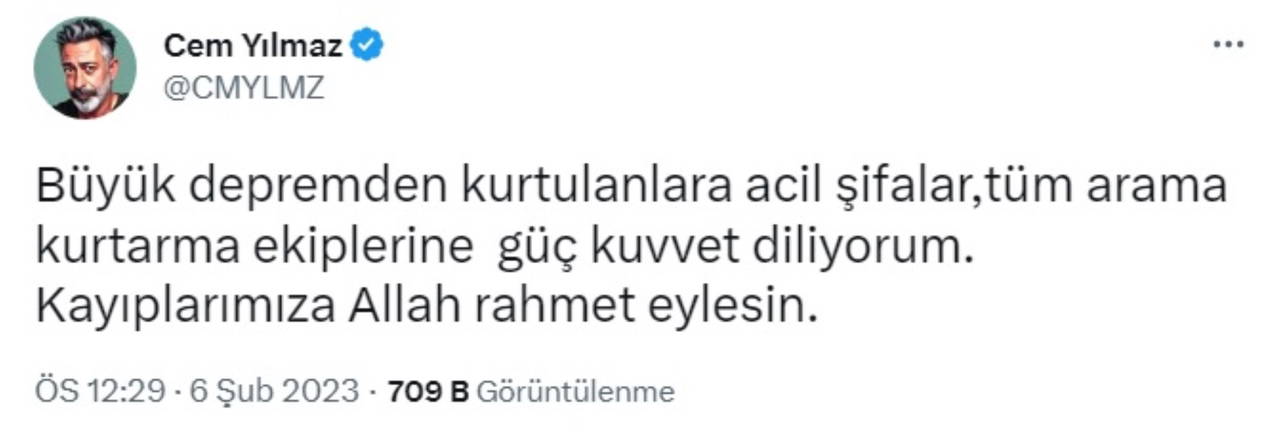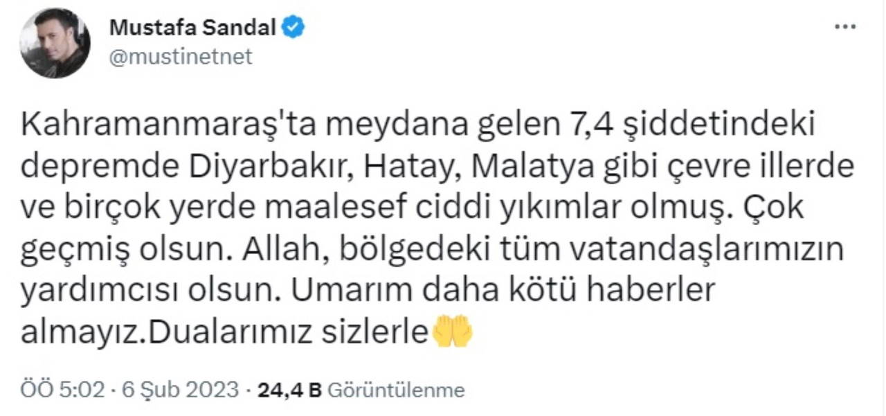 Kahramanmaraş'taki 7,7 büyüklüğündeki depremin ardından sanatçılar sosyal medya hesaplarından 'geçmiş olsun' mesajları paylaştı.