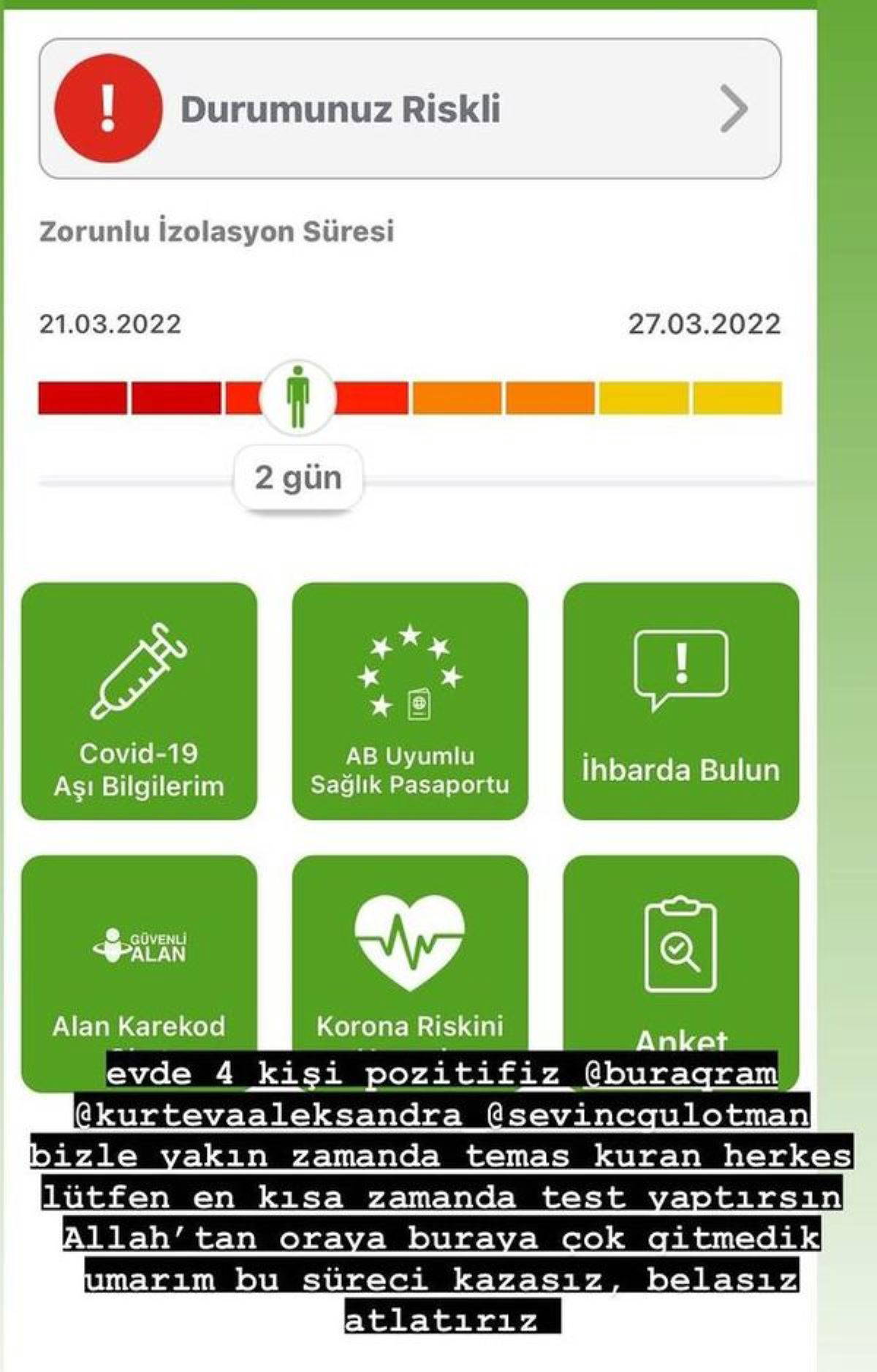 "Evde 4 kişi pozitifiz. Bizle yakın zamanda temas kuran herkes lütfen en kısa zamanda test yaptırsın. Allah'tan oraya buraya çok gitmedik. Umarım bu süreci kazasız, belasız atlatırız."