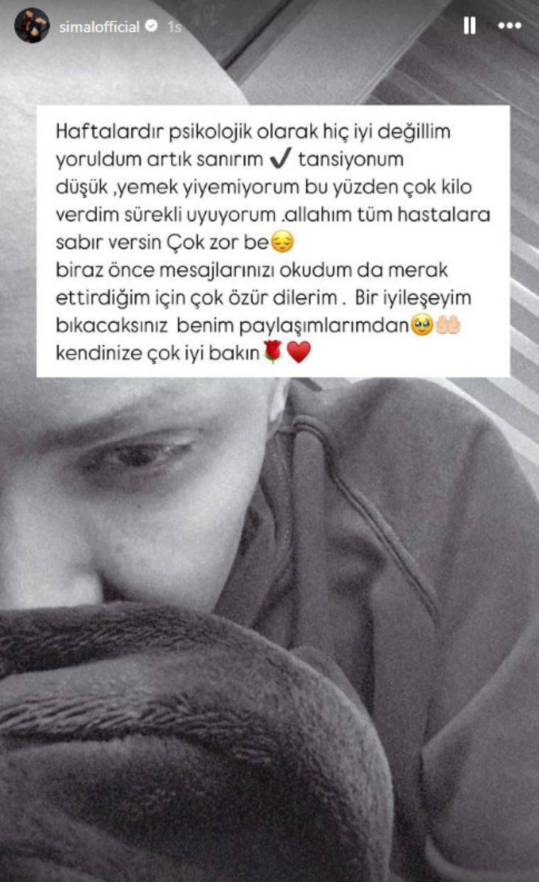Şimal, "Haftalardır psikolojik olarak iyi değilim. Yoruldum artık sanırım. Tansiyonum düşük, yemek yiyemiyorum. Bu yüzden çok kilo verdim. Sürekli uyuyorum. Allahım tüm hastalara sabır versin. Çok zor be. Biraz önce mesajlarınızı okudum da merak ettirdiğim için özür dilerim. Bir iyileşeyim bıkacaksınız paylaşımlarımdan. Kendinize çok iyi bakın" mesajını yazdı.