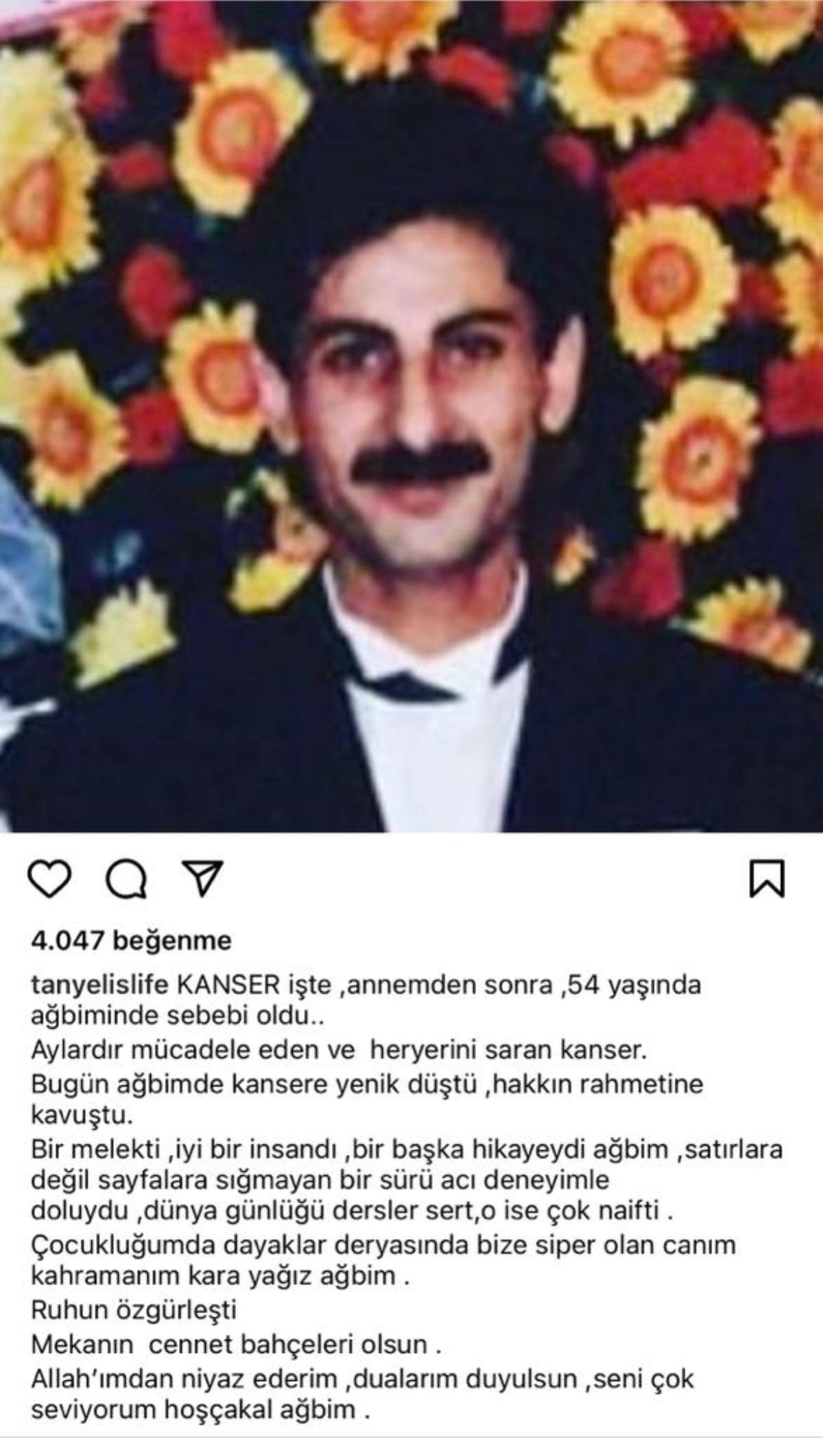 Acı haberi Instagram hesabından duyuran Tanyeli, "Kanser işte annemden sonra 54 yaşında ağabeyimin de sebebi oldu. Aylardır mücadele eden ve her yerini saran kanser… Bugün ağabeyim de kansere yenik düştü, hakkın rahmetine kavuştu. Bir melekti, iyi bir insandı, bir başka hikayeydi ağabeyim, satırlara değil sayfalara sığmayan bir sürü acı deneyimle doluydu. Çocukluğumda dayaklar deryasında bize siper olan canım kahramanım kara yağız ağabeyim. Ruhun özgürleşti. Mekanın cennet bahçeleri olsun. Allah’ımdan niyaz ederim, dualarım duyulsun, seni çok seviyorum hoşçakal ağabeyim" ifadelerini kullandı.