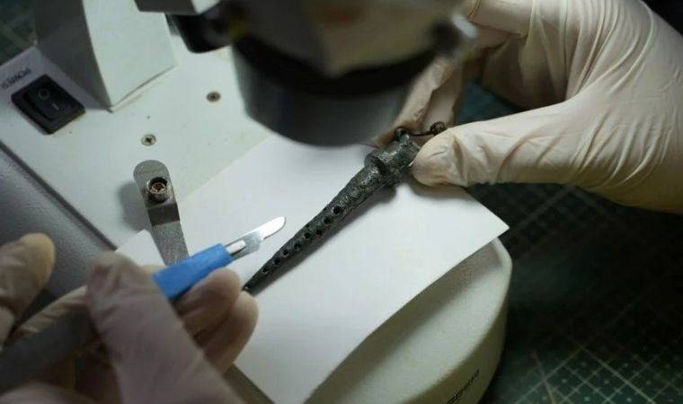 "Bu çalışmalar esnasında önemli buluntulara ulaştık" diyen Çeklikbaş, "Bu buluntulardan bir tanesi de filtre olarak kullanılan bronz bir obje. Antik dönemde insanların içeceklerini içerken posasından içeceği ayırmak için kullandıkları bir obje bu filtre. Pipetlerin ucuna takıyorlar. Bu pipet yaklaşık bir metre uzunluğunda oluyor. Ortaya koydukları bir kabın içerisinden de insanlar hem sohbetlerini yapıyorlar hem de içeceklerini içiyorlar" ifadelerini kullandı.
