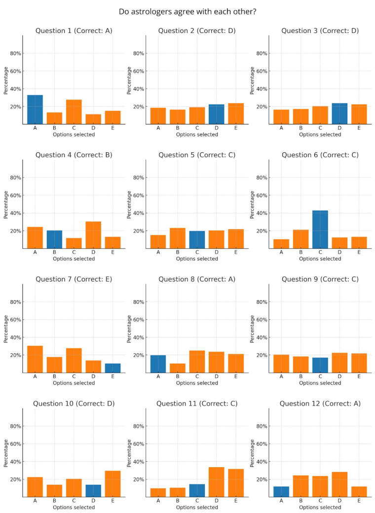 Araştırmaya göre astrologlar birbirleriyle aynı fikirde değildi. Astrologların 12 soruda verdiği cevaplar oran olarak aşağıdaki tabloda gösterildi. Doğru cevaplar mavi barlarda belirtildi.