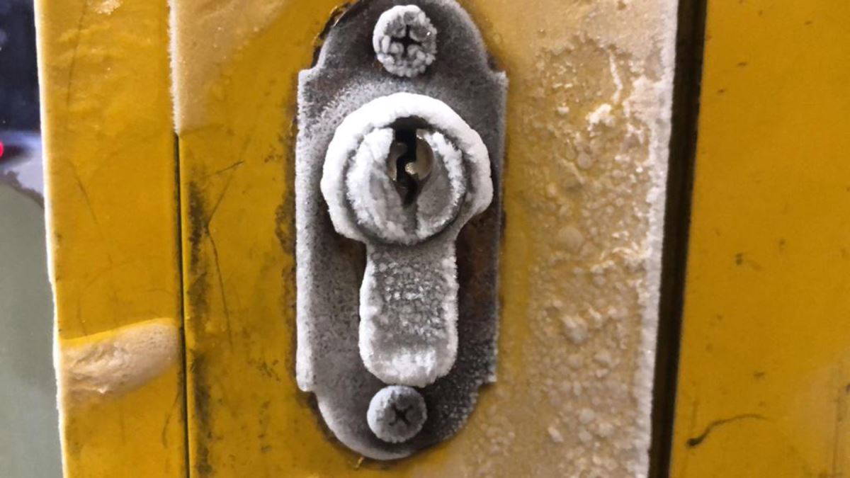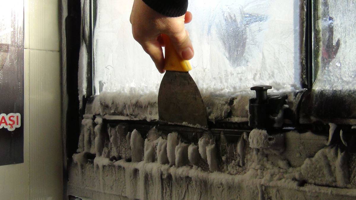 İşyeri çalışanı buz tutan cam ve çerçeveleri adeta kazıyarak buzlarını temizledi. İşyerinin donan kapı kilidi ve camlarını havanın ne kadar soğuk olduğunu gözler önüne serdi.