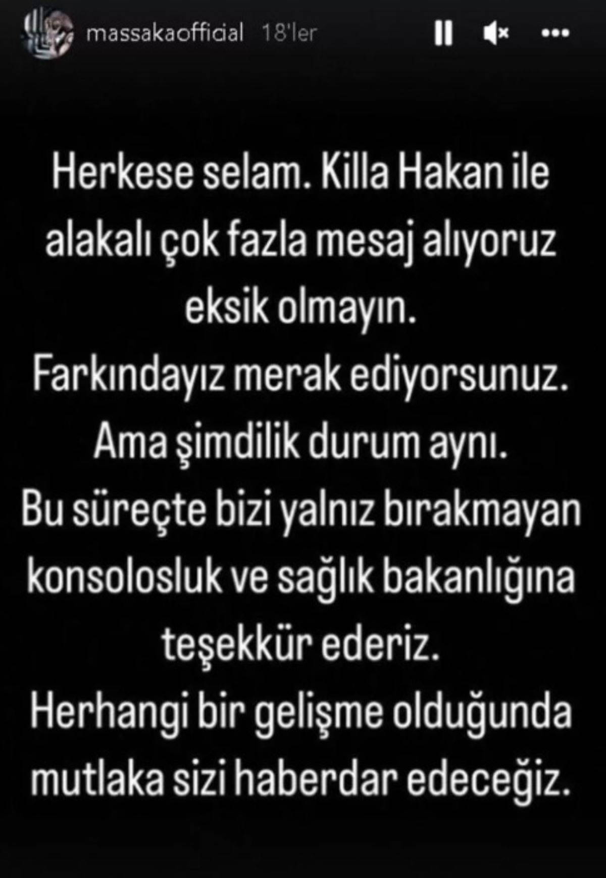 "Herkese selam. Killa Hakan ile alakalı çok fazla mesaj alıyoruz eksik olmayın. Farkındayız merak ediyorsunuz. Ama şimdilik durum aynı. Bu süreçte bizi yalnız bırakmayan konsolosluk ve Sağlık Bakanlığı'na teşekkür ederiz. Herhangi bir gelişme olduğunda mutlaka sizi haberdar edeceğiz."