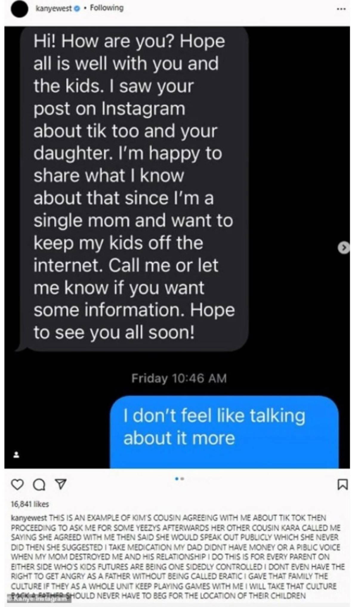 Geçen hafta West, Instagram hesabından kızı North’un bir fotoğrafını paylaşarak, “Bu benim ilk boşanmam olduğu için kızımın benim isteğim dışında TikTok'a konması konusunda ne yapmam gerekiyor?” şeklinde bir paylaşım yaptı.
