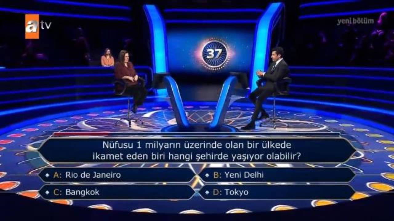 Nüfusu 1 milyarın üzerinde olan bir ülkede ikamet eden biri hangi şehirde yaşıyor olabilir?" sorusunun yöneltiği yarışmacı yarı yarıya joker hakkını kullandıktan sonra "Tokyo" cevabını verdi.
