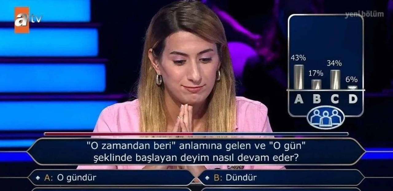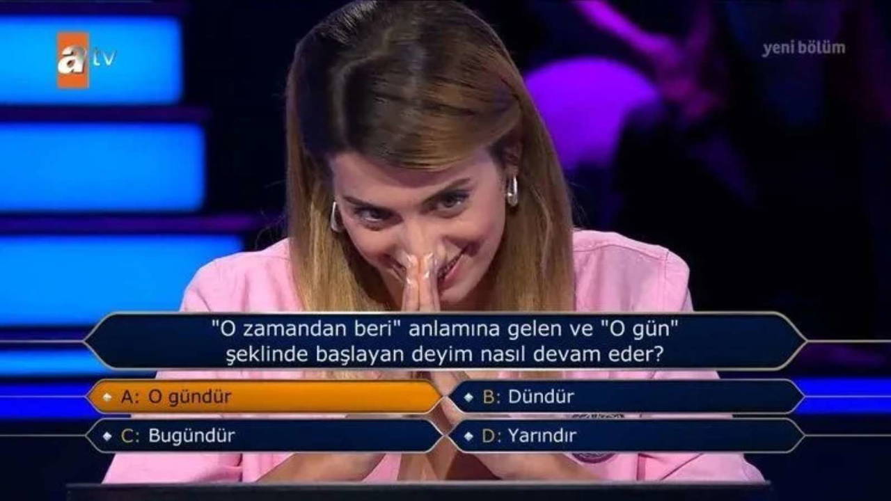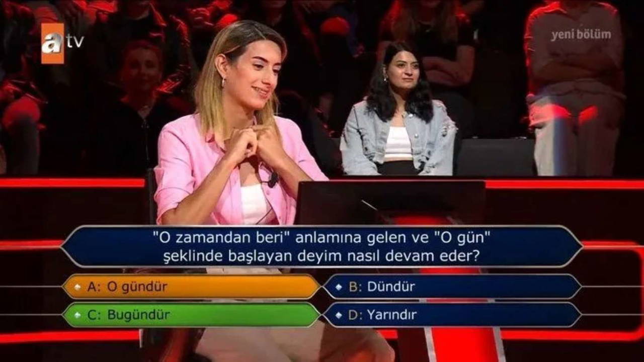 Üçüncü soruda yarışmacının karşısına, "O zamandan beri anlamına gelen ve 'o gün' şeklinde başlayan deyim nasıl devam eder?" sorusu çıktı.