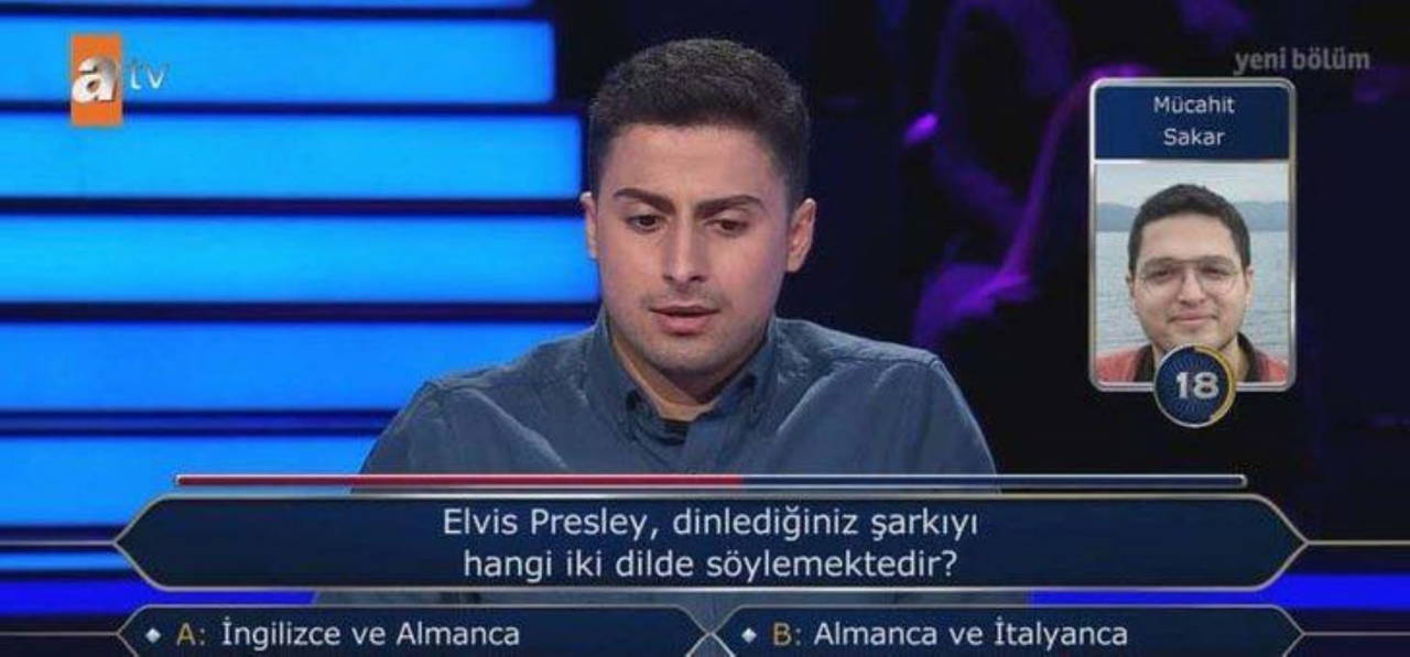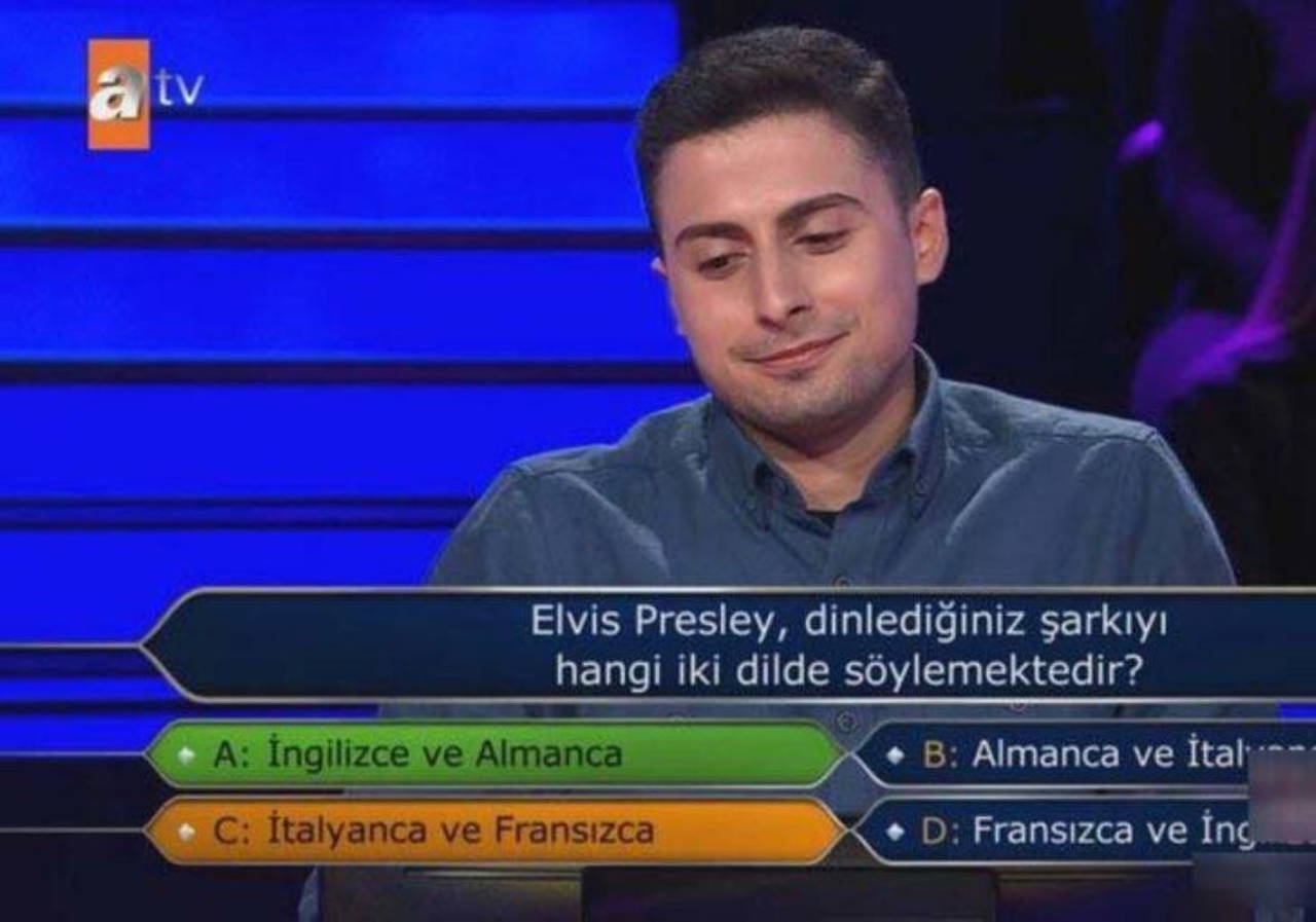 Yarışmacı, üçüncü soruda karşısına çıkan, 'Elvis Presley dinlediğiniz şarkıyı hangi iki dilde söylemektedir?' sorusuna cevap verdi.