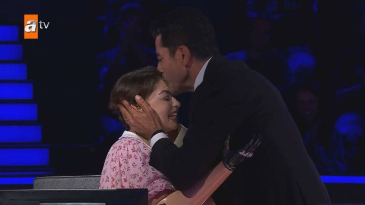 İmirzalıoğlu, 400.000 TL'lik soruyu bilerek 1 milyon liralık soruyu açtırmaya hak kazanan Rabia'yı alnından öptü.