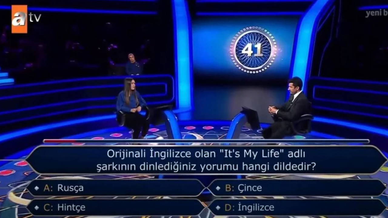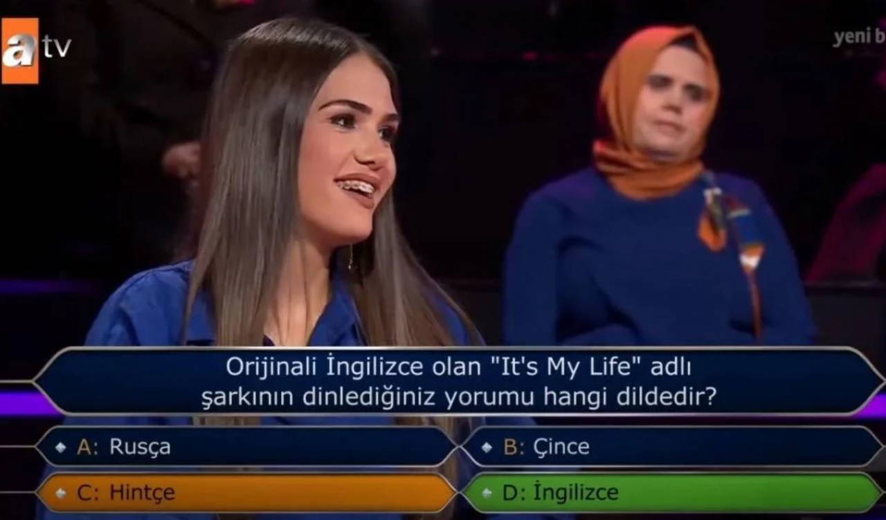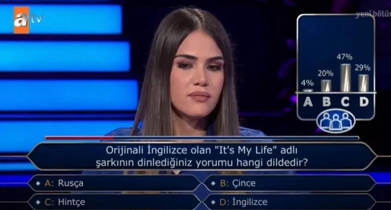 Dereli'nin karşısına, "Orjinali İngilizce olan 'It's My Life' adlı şarkının dinlediğiniz yorumu hangi dildedir?" sorusu çıktı.