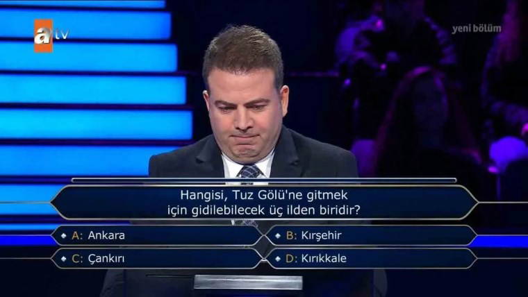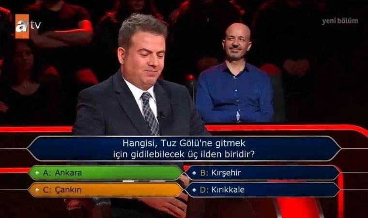 ATV'nin büyük ilgiyle takip edilen ve sevilen yarışmalarından biri olan "Kim Milyoner Olmak İster", bu hafta da Pazar günü ekranlara geldi. Programın ünlü sunucusu Kenan İmirzalıoğlu'nun başarılı sunumuyla izleyicileri ekran başına kilitleyen yarışmada, bu hafta da çarpıcı anlar yaşandı. Kim Milyoner Olmak İster'e katılan Gazi Üniversitesi Tıp Fakültesi mezunu Mustafa Kıraç isimli yarışmacıya sorulan "Hangisi, Tuz Gölü'ne gitmek için gidilebilecek üç ilden biridir?" sorusu geceye damga vurdu. Yarışmacı telefon jokerini de kullandı ama kendi istediği cevap ile büyük bir hüsrana uğradı. Yarışmacının verdiği cevap kısa sürede sosyal medyada gündem oldu. İşte ayrıntılar...