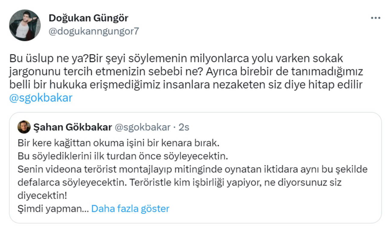 Doğukan Güngör, Gökbakar’ı etiketleyerek “Bu üslup ne ya? Bir şeyi söylemenin milyonlarca yolu varken sokak jargonunu tercih etmenizin sebebi ne? Ayrıca birebir de tanımadığımız, belli bir hukuka erişmediğimiz insanlara nezaketen siz diye hitap edilir…” yazdı.