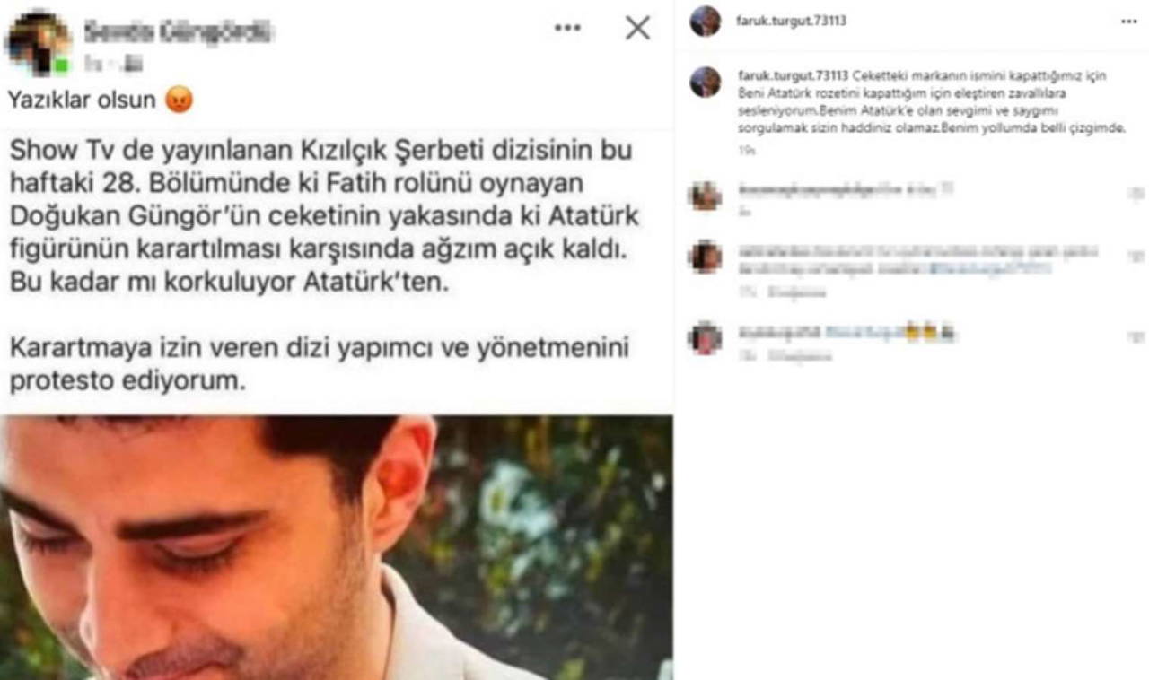 Paylaşımı gören dizinin yapımcısı Faruk Turgut ise Instagram hesabından tepki göstererek "'Atatürk rozetin kapattılar' diye algı yaratan zavallılara sesleniyorum. Benim Atatürk'e olan sevgimi ve saygımı sorgulamak sizin haddiniz olamaz. Benim yollum da belli, çizgim de" ifadelerini kullandı.