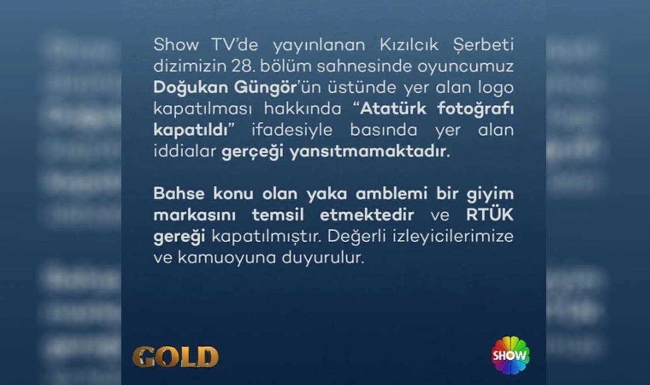 "Show TV'de yayınlanan Kızılcık Şerbeti dizisinin 28 bölüm sahnesinde oyuncumuz Doğukan Güngör'ün üstünde yer alan logonun kapatılması hakkında 'Atatürk fotoğrafı' kapatıldı ifadesiyle basında yer alan iddialar gerçeğe yansıtmamaktadır. Bahse konu olan yaka amblemi bir giyim markasını temsil etmektedir ve RTÜK gereği kapatılmıştır. Değerli izleyicilerimize ve Kamuoyuna duyurulur…"