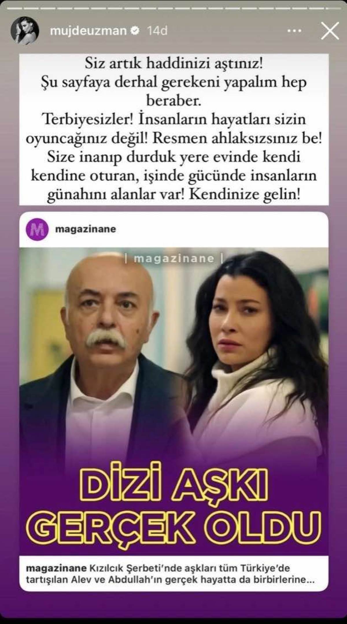 Ünlü oyuncu Müjde Uzman sosyal medyada yaptığı paylaşımda, "Dizi aşkı gerçek oldu" haberlerini alıntılayarak "Siz artık haddinizi aştınız. Terbiyesizler! İnsanların hayatları sizin oyuncağınız değil! Resmen ahlaksızsınız be! Size inanıp durduk yere evinde kendi kendine oturan, işinde gücünde insanların günahını alanlar var! Kendinize gelin! " ifadelerini kullandı.