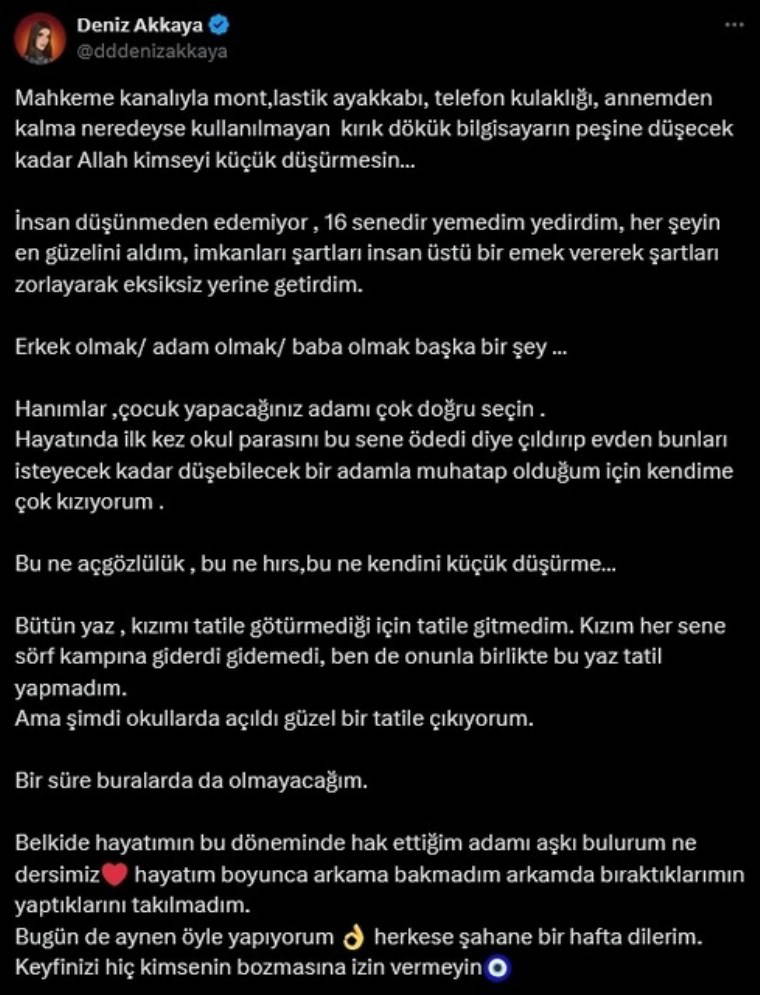 "Mahkeme kanalıyla mont, lastik ayakkabı, telefon kulaklığı, annemden kalma kırık dökük bilgisayarın peşine düşecek kadar küçük düşmek... İnsan düşünmeden edemiyor, 16 senedir yemedim, yedirdim. Her şeyin en güzelini aldım, imkanları zorladım. Erkek olmak, adam olmak, baba olmak başka bir şey… Hanımlar, çocuk yapacağınız adamı çok doğru seçin. Hayatımda ilk kez okul parasını bu sene ödedi diye çıldırıp bunları isteyecek kadar düşebilecek biriyle muhatap olduğum için kendime kızıyorum."