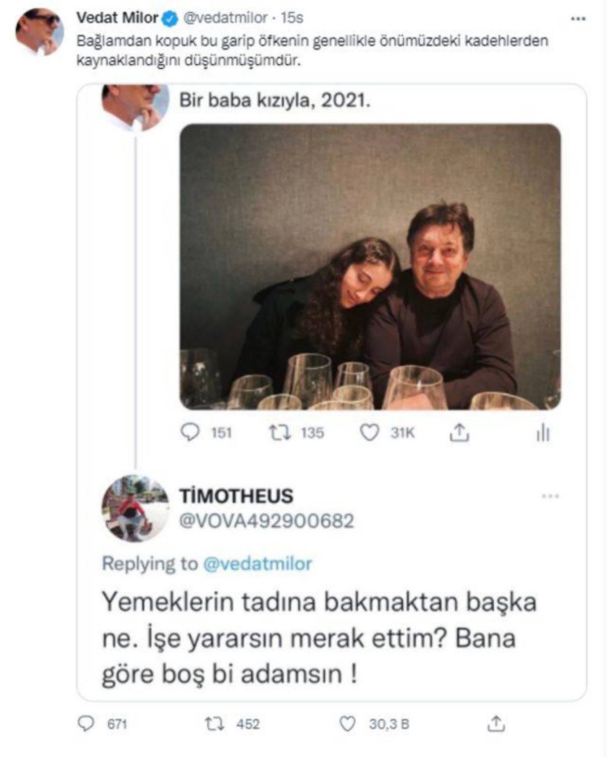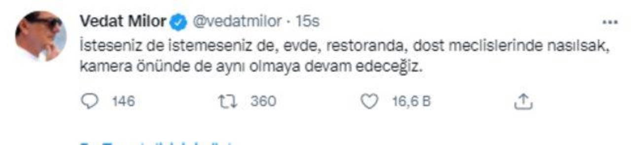 Twitter hesabı üzerinden takipçileriyle etkileşim halinde olan Vedat Milor'dan son olarak yeni bir paylaşım geldi.