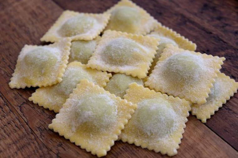 Ravioli hamuru için; un, tuz ve irmik ununu geniş bir karıştırma kabına alın. Ardından yumurtaları ekleyin.Hamuru kıvam alana kadar yoğurun.Streç filmle sarıp 30 dakika kadar buzdolabında dinlendirin.Ravioli hamurlarını açmadan önce iç harcı hazırlayın. Kuru soğanı ve sarımsağı rondoda püre haline getirin ya da minik küpler halinde doğrayın. Sıvı yağ ile tavada kavurun.Kavrulan sarımsak ve soğanın üzerine kıyma, tuz ve karabiberi ilave edip pişirmeye devam edin.Son olarak un ve cevizi ekleyip suyunu çeken ve pişen kıymalı harcı bir kenara alın.Hamuru 2 bezeye ayırın. Mutfak tezgahını hafifçe unlayıp bir adet hamur bezesini merdane yardımıyla yufkadan biraz daha kalın olacak şekilde açın.Açtığınız hamurların kenar kısımlarını keserek uzun dikdörtgen şekline getirin.Hazırladığınız kıymalı harç bir kenarda soğumuş olsun.Kare hamur parçalarının orta kısımlarına hazırladığınız kıymalı iç harçtan bir tatlı kaşığı kadar yerleştirin.Yaklaşık 8x8 cm olacak şekilde kare parçalar halinde kesin. Ravioli makarna hamurlarının kenar kısımlarını bir fırça yardımıyla su ile ıslatın. Üzerine bir kat hamur kapatıp kare şeklini verin.Kenar kısımlarının üzerinden tırtıklı ya da düz bir kesici yardımıyla keserek yapışmalarını ve şekil almalarını sağlayın. İç harcın etrafını elinizle bastırarak hamurların yapışmasını sağlayın.Aynı işlemi diğer hamur bezelerine de uygulayın. Şekil verdiğiniz makarnaları bir servis tabağına alın.Derin bir tencerede, kullandığınız tencerenin yarısı kadar kaynamış suyu hazırlayın. Taze taze açılmış ravioli makarnalarını 8-10 dakika kadar haşlayın. Haşlanan makarnaları bir süzgeç yardımıyla çıkartıp fazla sularını süzdürün.Servis tabağına alıp arzuya göre ince kıyılmış maydanoz ve çekilmiş karabiber eşliğinde servis edebilirsiniz.