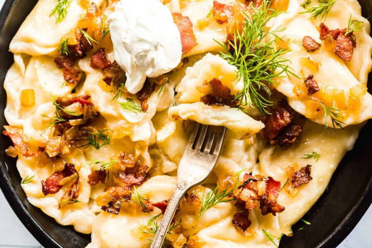 Hamuru için olan bütün malzemeleri bir araya getirerek yoğurun. Oluşan hamuru kenarda dinlendirmeye bırakın. Harç için patatesler tuzlu suda haşlayın. Haşlanan patatesleri süt ile ezilin, tuz ve karabiber ilave ederek tatlandırın. Yağları tavaya alın ve soğanı renk alana kadar kavurun. Kavrulan soğanı da patatesli karışıma ekleyin ve harcı soğumaya bırakın. Dinlenen hamuru açın ve halkalar kesin. İçerisine harçtan koyarak kapatın. Kaynar suda haşlayın. Servis için soğanı pudra şekeri ile birlikte kavurun. Haşlananların üzerine soğan ve yeşil soğan serperek servis edin.