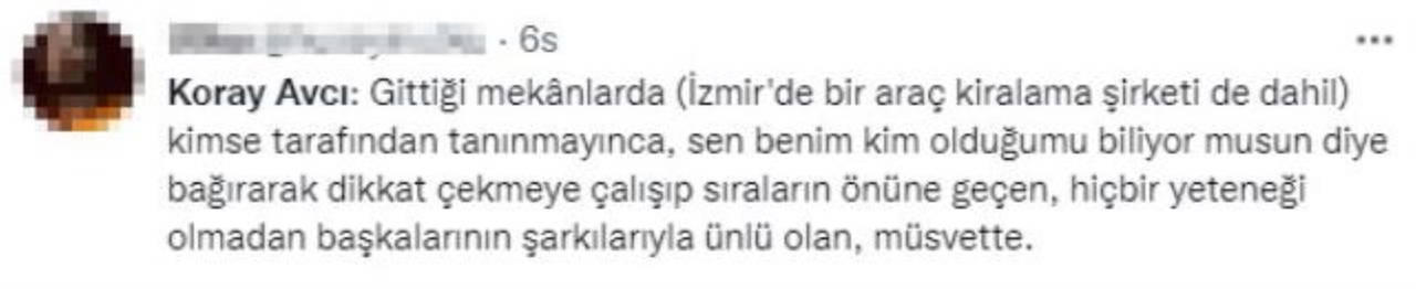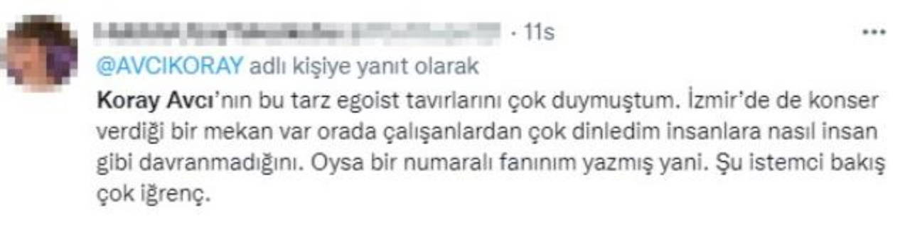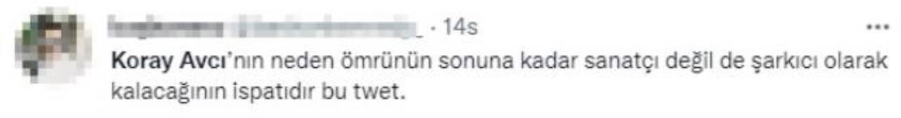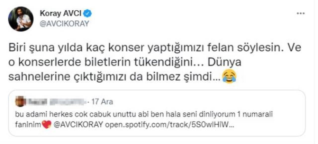 Koray Avcı, "Bu adamı herkes çok çabuk unuttu abi ben hala dinliyorum. Bir numaralı fanıyım" diyen takipçisine "Biri şuna yılda kaç konser yaptığımızı falan söylesin. Ve o konserlerde biletlerin tükendiğini... Dünya sahnelerine çıktığımızı da bilmez şimdi" cevabını verdi.