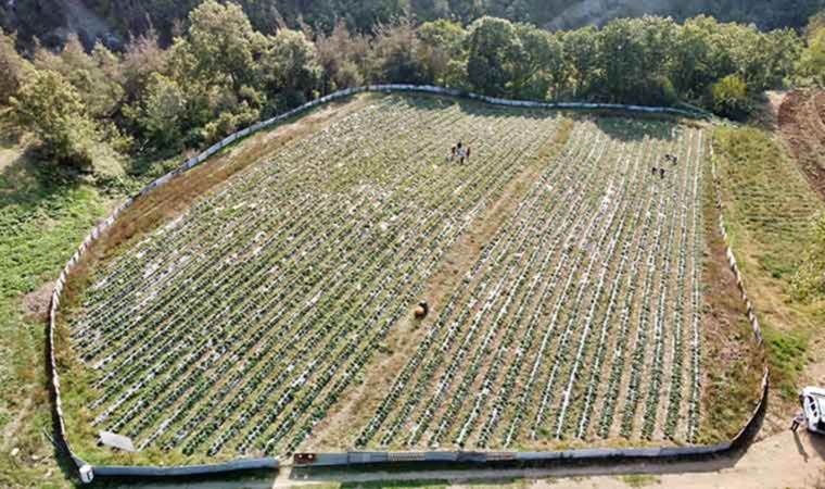 Çevresi düzenlenen ve sulama sistemi kurulan dağ yamacındaki arazi, fidelerin olgunlaşmasıyla yeşil görüntüye kavuştu.