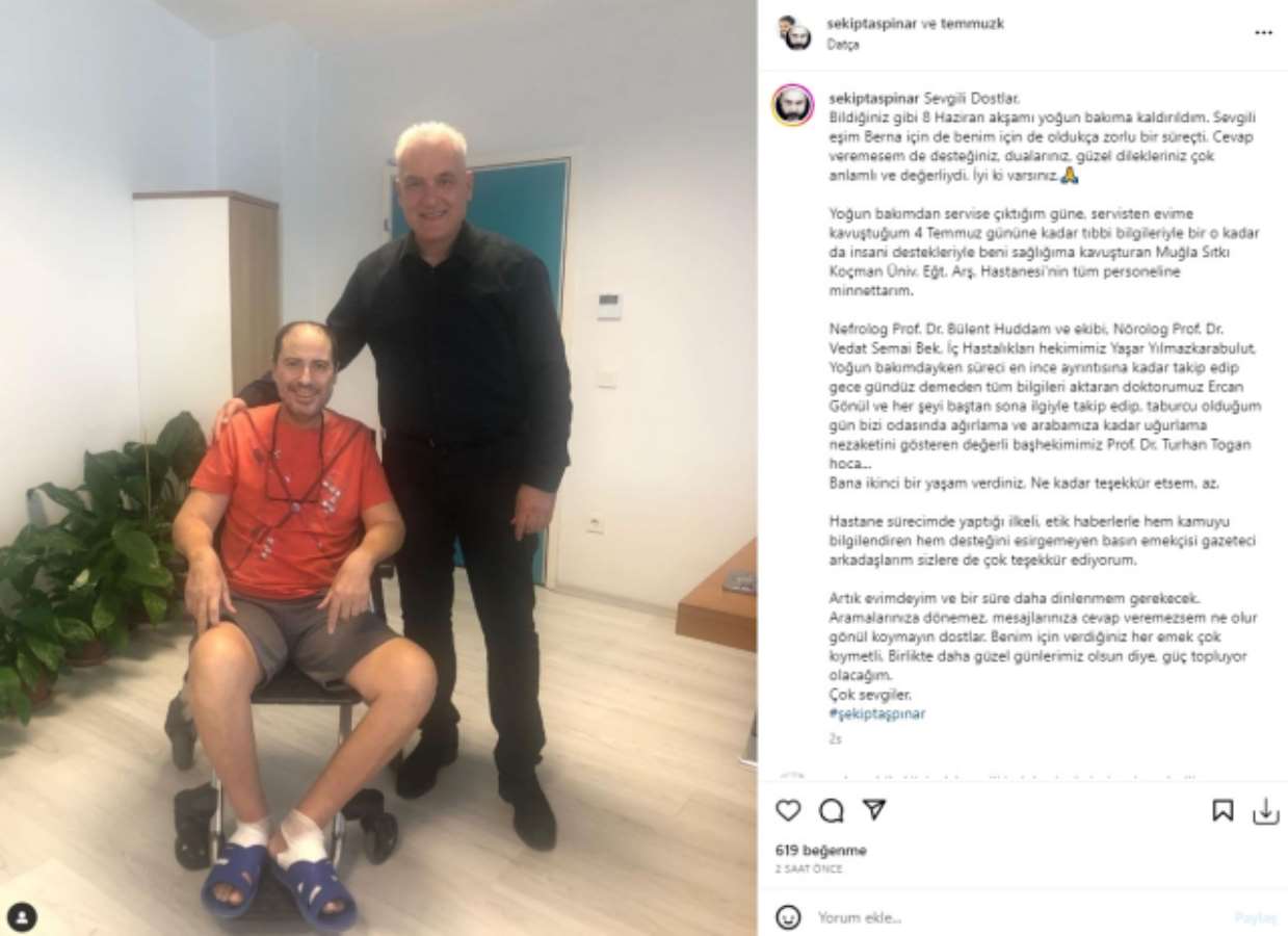 "Sevgili Dostlar, bildiğiniz gibi 8 Haziran akşamı yoğun bakıma kaldırıldım. Sevgili eşim Berna için de benim için de oldukça zorlu bir süreçti. Cevap veremesem de desteğiniz, dualarınız, güzel dilekleriniz çok anlamlı ve değerliydi. İyi ki varsınız. Yoğun bakımdan servise çıktığım güne, servisten evime kavuştuğum 4 Temmuz gününe kadar tıbbi bilgileriyle bir o kadar da insani destekleriyle beni sağlığıma kavuşturan Muğla Sıtkı Koçman Üniv. Eğt. Arş. Hastanesi'nin tüm personeline minnettarım."