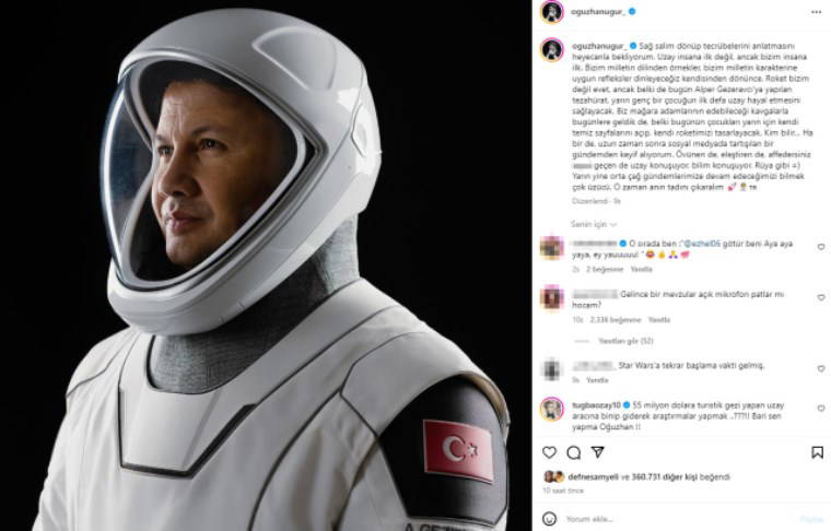 Oğuzhan Uğur'un Alper Gezeravcı'yla ilgili paylaşımına yorum yapan Tuğba Özay Alper Gezeravcı'nın uzay yolculuğunu turistik gezi olarak yorumladı.