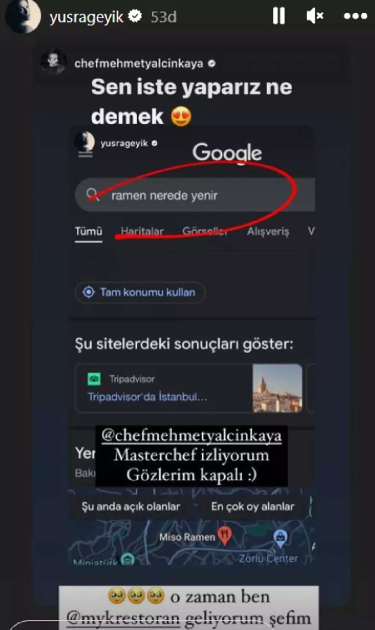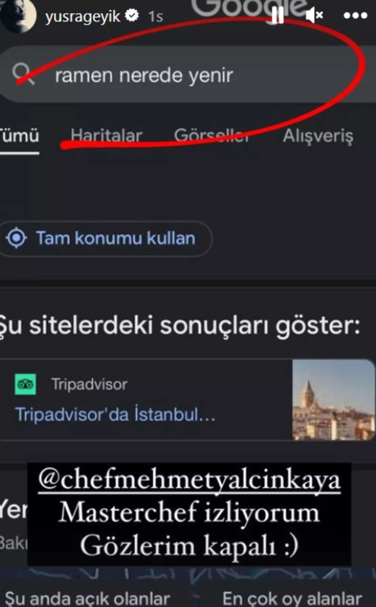 Arama motorunda "Ramen nerede yenir" diye aratan Geyik bu paylaşımına MasterChef jüri üyelerinden biri olan Mehmet Yalçınkaya'yı etiketledi.