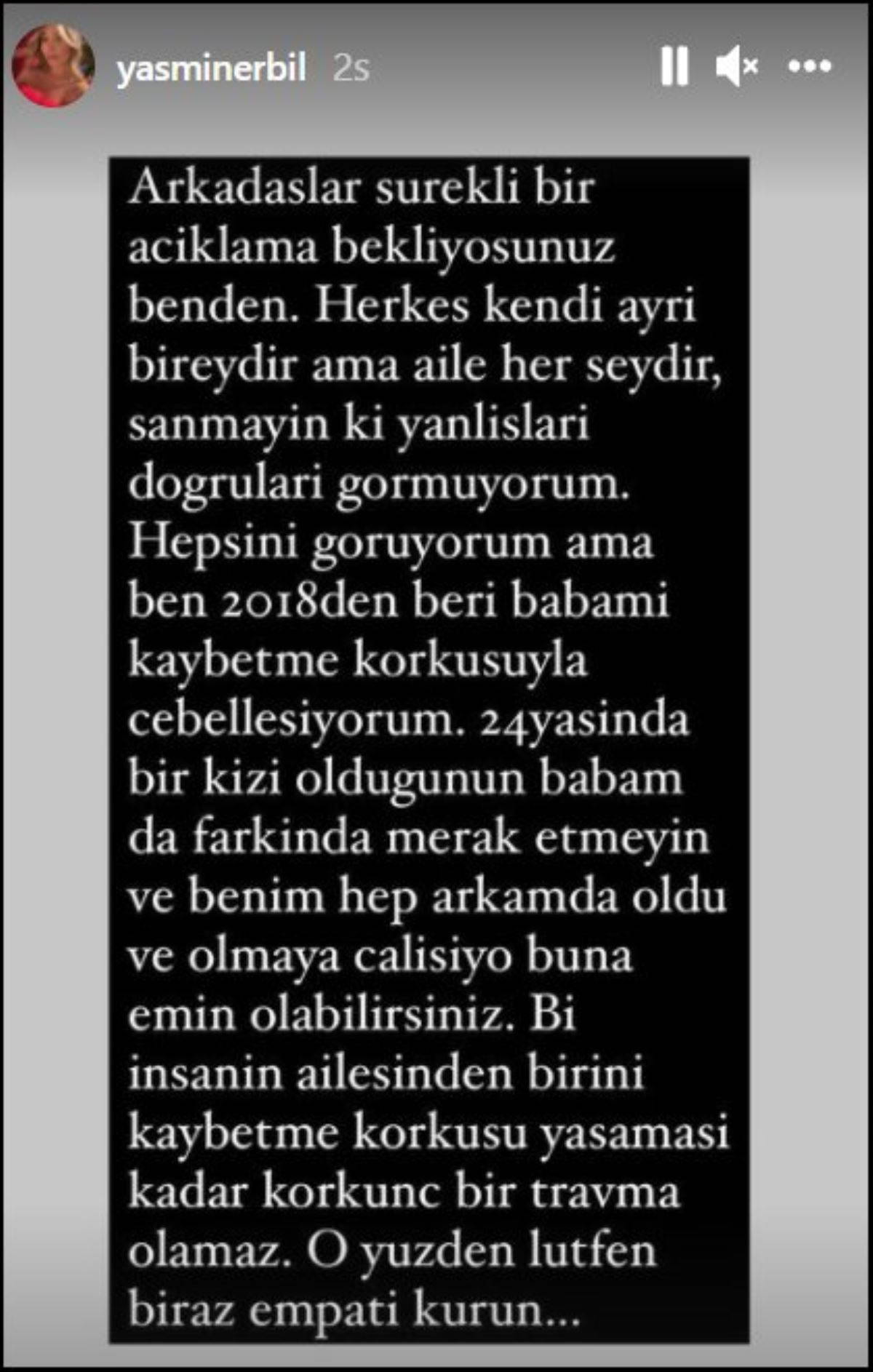 "Herkes kendi ayrı bireydir ama aile her şeydir, sanmayın ki yanlışları doğruları görmüyorum. Hepsini görüyorum ama ben 2018'den beri babamı kaybetme korkusuyla cebelleşiyorum. 24 yaşında bir kızı olduğunun babam da farkında merak etmeyin ve benim hep arkamda oldu ve olmaya da çalışıyor buna emin olabilirsiniz. Bir insanın ailesinden birinin kaybetme korkusu yaşaması kadar korkunç bir travma olamaz."