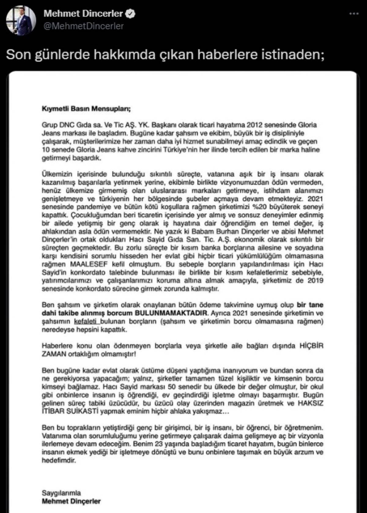 "Ben şahsım ve şirketim olarak onaylanan bütün ödeme takvimine uymuş olup, bir tane dahi takibe alınmış borcum bulunmamaktadır. Ayrıca 2021 senesinde şirketimin ve şahsımın kefaleti bulunan borçların (şahsım ve şirketimin borcu olmamasına rağmen) neredeyse hepsini kapattık. Haberlere konu olan ödenmeyen borçlarla veya şirketle aile bağlantıları dışında hiçbir zaman ortaklığım olmamıştır."
