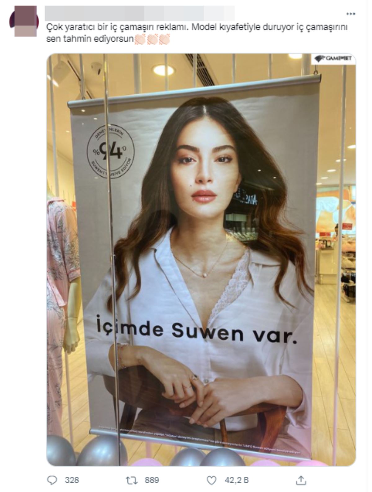 Ünlü oyuncu Melisa Aslı Pamuk, reklam yüzü olduğu iç çamaşırı markasının, mağazasına astığı reklam afişiyle gündeme geldi. Suwen isimli markanın mağazasına astığı bu reklamda herhangi bir iç çamaşırı gözükmüyor, bunun yerine normal kıyafetler yer alıyordu. Reklamın üzerinde yazan metindeyse “İçimde Suwen var” ifadeleri yer alıyordu.