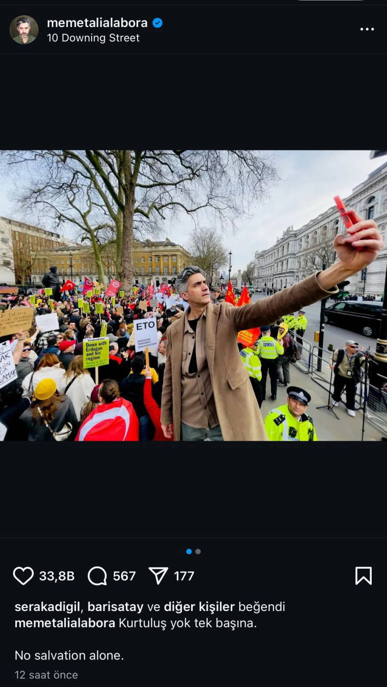 Londra'da gerçekleştirilen gösterilere katılan Alabora paylaşımına "Kurtuluş yok tek başına" notunu düştü.