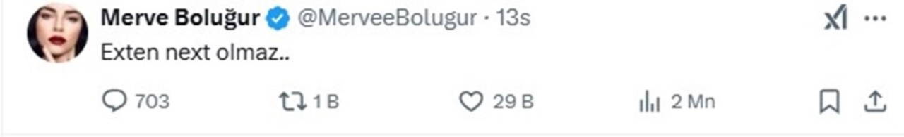 Merve Boluğur, sosyal medya hesabından yaptığı paylaşımda, “Son zamanlarda sadece hikayelere sardım, film falan hak getire...” ifadelerini kullanarak iddiaları dikkate almadığını gösterdi. Öte yandan, X platformunda Boluğur adına açılmış ancak resmi olmadığı belirtilen bir hesaptan yapılan “Eskiden, yeni olmaz” paylaşımı da dikkat çekti.