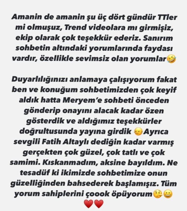 Hülya Avşar'ın açıklamaları şu şekilde; "Amanın de amanın şu üç - dört gündür TT'ler mi olmuşuz, trend videolara mı girmişiz... Ekip olarak çok teşekkür ederiz. Sanırım sohbetin altındaki yorumların da faydası vardır, özellikle sevimsiz olan yorumlar... Duyarlılığınızı anlamaya çalışıyorum fakat ben ve konuğum sohbetimizden çok keyif aldık hatta Meryem'e sohbeti önceden gönderip onayını alacak kadar özen gösterdik ve aldığımız teşekkürler doğrultusunda yayına girdik. Ayrıca sevgili Fatih Altaylı dediğin kadar varmış gerçekten çok güzel, çok tatlı ve çok samimi. Kıskanmadım, aksine bayıldım. Ne tesadüf ki ikimiz de sohbetimize onun güzelliğinden bahsederek başlamışız. Tüm yorum sahiplerini çok öpüyorum."