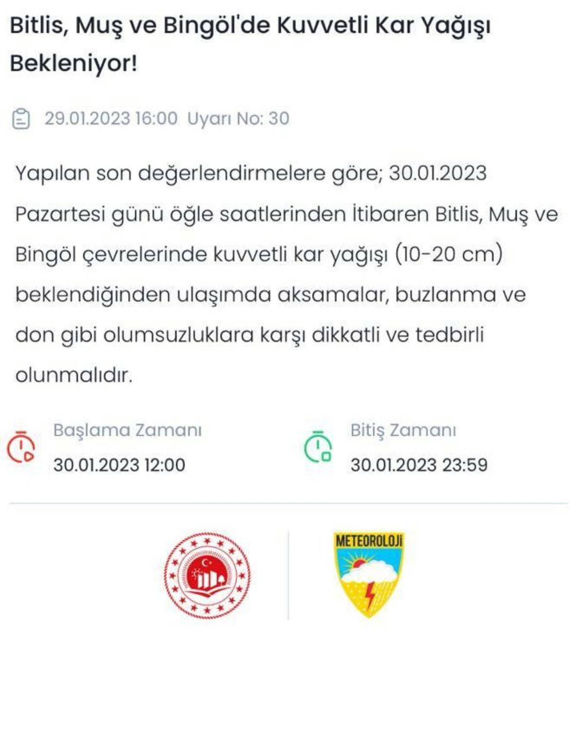 “30 Ocak 2023 Pazartesi günü öğle saatlerinden itibaren Bitlis, Muş ve Bingöl çevrelerinde kuvvetli kar yağışı (10-20 cm) beklendiğinden, ulaşımda aksamalar, buzlanma ve don gibi olumsuzluklara karşı tedbirli olunmalıdır.”