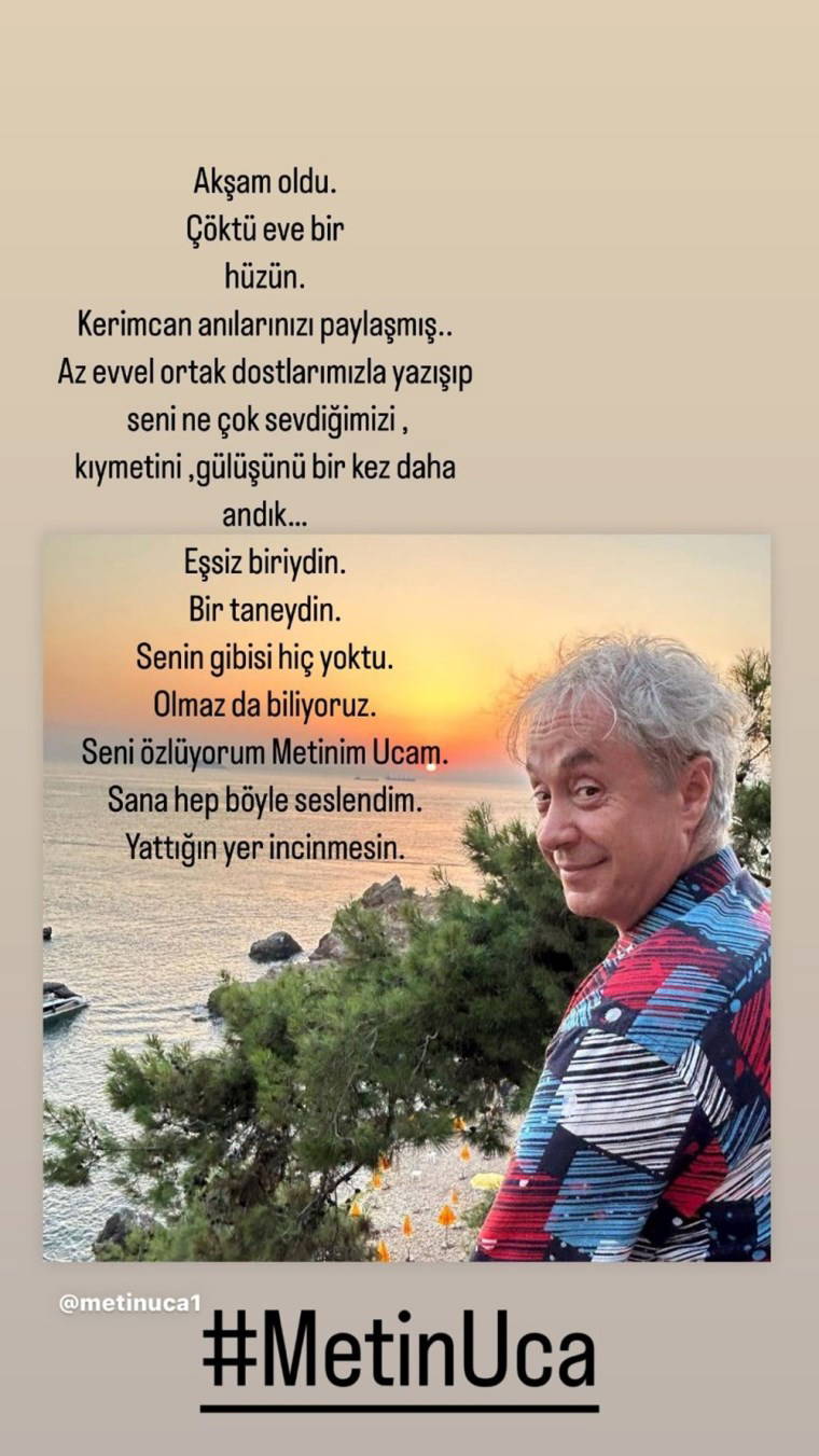 "Akşam oldu. Çöktü eve bir hüzün. Kerimcan anılarınızı paylaşmış. Az evvel ortak dostlarımızla yazışıp seni ne çok sevdiğimizi, kıymetini, gülüşünü bir kez daha andık. Eşsiz biriydin. Bir taneydin. Senin gibisi hiç yoktu. Olmaz da biliyorum. Seni özlüyorum Metin Uca'm. Sana hep böyle seslendim. Yattığın yer incitmesin."