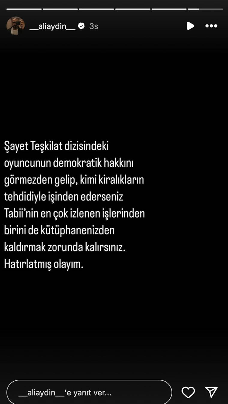 “Şayet Teşkilat dizisindeki oyuncunun demokratik hakkını görmezden gelip, kimi kiralıların tehdidiyle işinden ederseniz Tabii'nin en çok izlenen işlerinden birini de kütüphanenizden kaldırmak zorunda kalırsınız. Hatırlatmış olayım.”