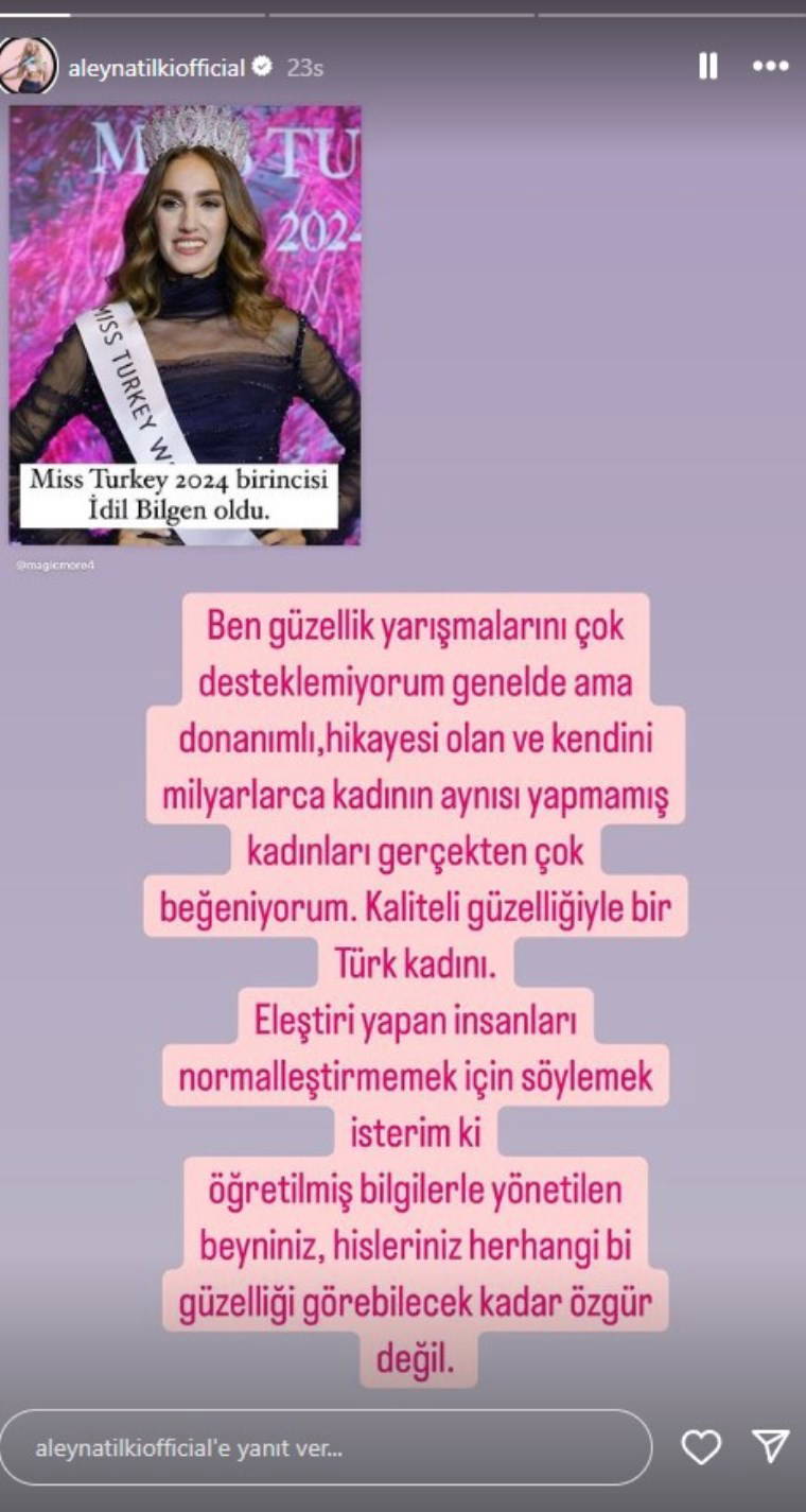 "Genellikle güzellik yarışmalarını çok desteklemiyorum ama donanımlı, hikayesi olan, kendine has kadınları çok beğeniyorum. Kaliteli güzelliğiyle bir Türk kadını. Eleştiri yapan insanları normalleştirmemek adına bunu söylemeliyim ki, öğretilmiş bilgilerle yönetilen beyniniz ve hisleriniz, herhangi bir güzelliği algılayacak kadar özgür değil."