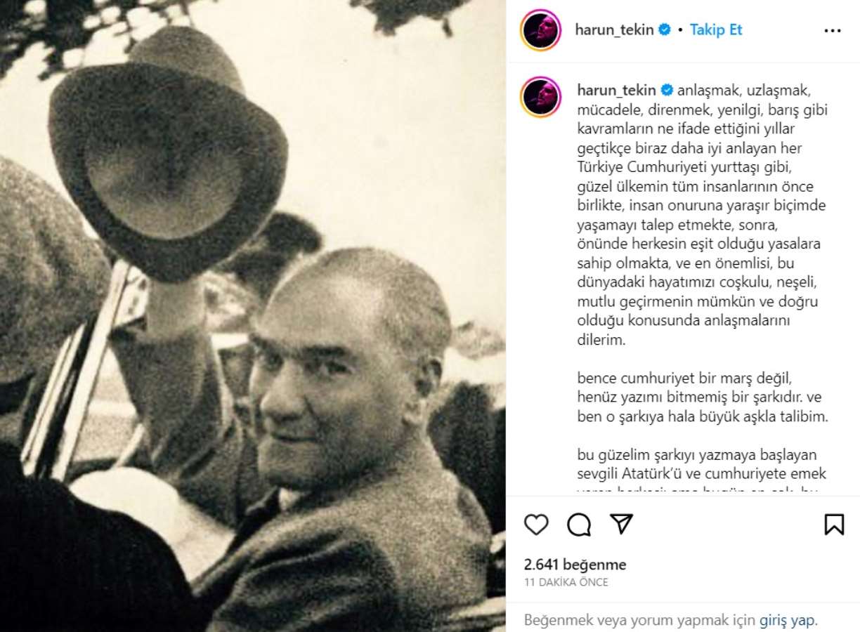 Kişisel Instagram hesabından Atatürk'ün bir fotoğrafını paylaşan Tekin, "Bence Cumhuriyet bir marş değil, henüz yazımı bitmemiş bir şarkıdır. Ve ben o şarkıya hala büyük aşkla talibim" dedi.