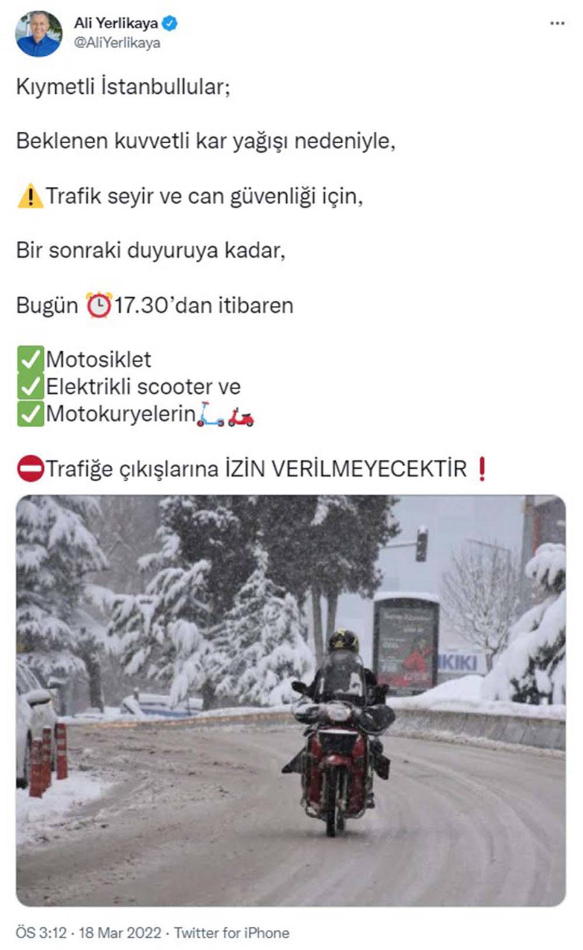 İstanbul Valisi Ali Yerlikaya yaptığı açıklamada, "Kıymetli İstanbullular; beklenen kuvvetli kar yağışı nedeniyle, trafik seyir ve can güvenliği için, bir sonraki duyuruya kadar bugün (18 Mart 2022) 17.30'dan itibaren motosiklet, elektrikli scooter ve motokuryelerin trafiğe çıkışlarına izin verilmeyecektir!" açıklamasında bulundu.