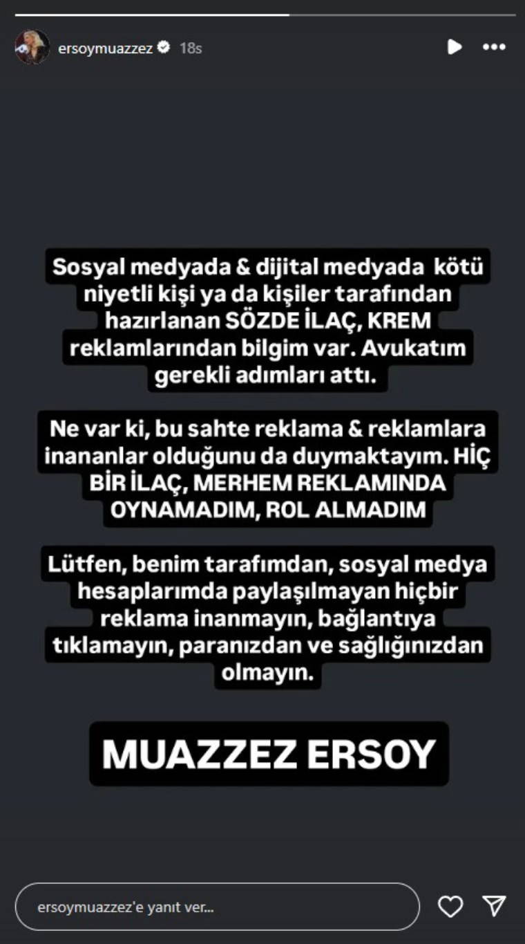 "Sosyal medya ve dijital medyada kötü niyetli kişi veya kişiler tarafından hazırlanan sözde ilaç, krem reklamlarından bilgim var. Avukatım gerekli adımları attı. Ne var ki bu sahte reklama ve reklamlara inananlar olduğunu da duymaktayım. Hiçbir ilaç, merhem reklamında oynamadım, rol almadım. Lütfen benim tarafımdan, sosyal medya hesaplarımda paylaşılmayan hiçbir reklama inanmayın, bağlantıya tıklamayın, paranızdan ve sağlığınızdan olmayın."