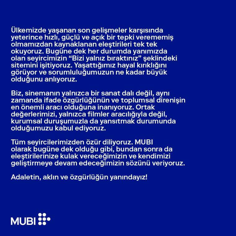 MUBI Türkiye'den "Adaletin, aklın ve özgürlüğün yanındayız!" açıklaması yapıldı.