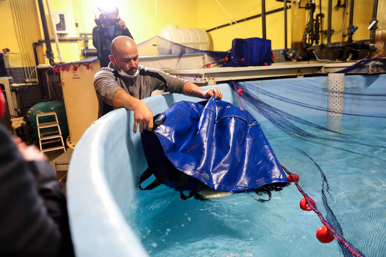 Güçlükle kontrol edilen köpek balığı 'Summer', hızla kamyonet içerisindeki tanka alındı. Tank içine de özel cihaz yerleştirilerek yolculuk süresince köpek balığına oksijen desteği sağlandı.