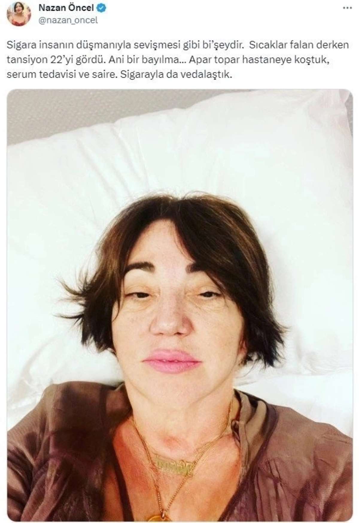Hastaneye kaldırıldığını ifade eden Öncel, fotoğrafıyla birlikte sağlık durumuna ilişkin bilgi de verdi.
