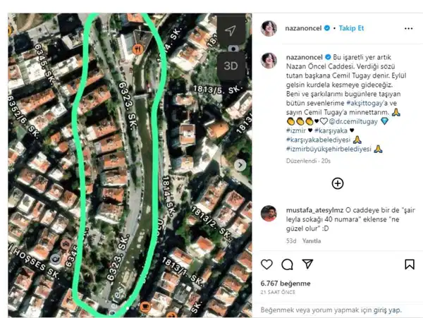 Instagram hesabından caddenin haritasını paylaşan sanatçı, "Bu işaretli yerin adı artık Nazan Öncel Caddesi. Verdiği sözü tutan başkana Cemil Tugay denir. Eylül gelsin, kurdele kesmeye gideceğiz. Beni ve şarkılarımı bugünlere taşıyan bütün sevenlerime minnettarım" ifadelerini kullandı.